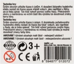 Plastist kazoo on suurepärane viis tutvustada lapsi ja algajaid muusikamaailmaga. Mängimine on väga lihtne – puhumise asemel piisab, kui ümised huulikusse, ning kazoo loob iseloomuliku sumiseva tooni. Tänu kompaktsele 12 cm pikkusele mahub see mugavalt taskusse ja on alati käepärast.