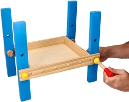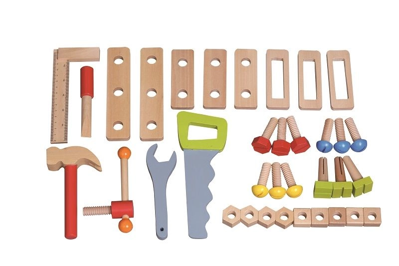 - Puidust töölaud + tööriistakomplekt (haamer, saag, kruvikeeraja, mutrivõti, kruvid, mutrid, hammasrattad ja muud detailid)
