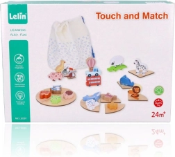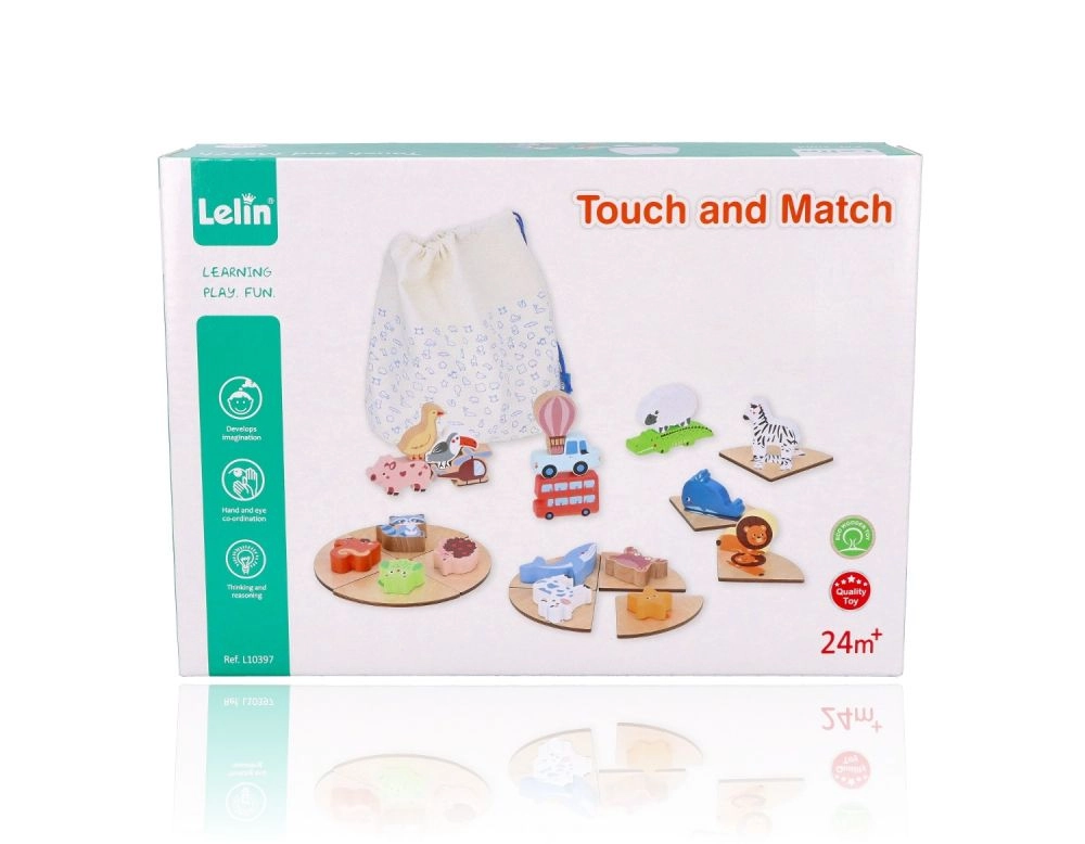See brändi LELIN „Touch & Match” tüüpi puidust mäng õpetab lapsi kompimise teel kujundeid ja pilte ära tundma. Värvilised puidust detailid loomade, transpordivahendite ja esemete motiividega sobitatakse vastavate alustega, samal ajal kui laps otsib õiget tükki pimesi riidest kotikesest.