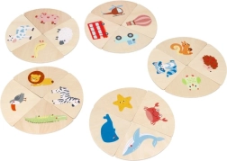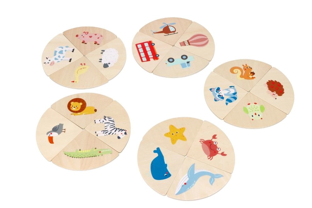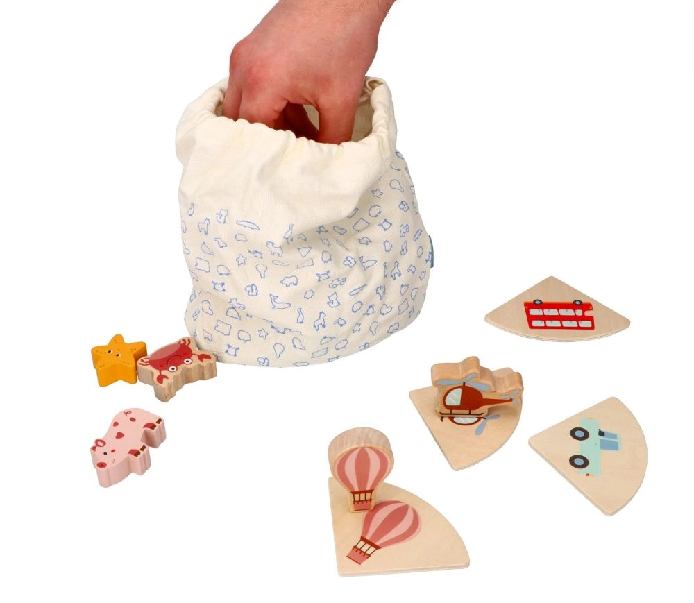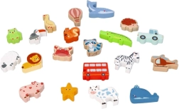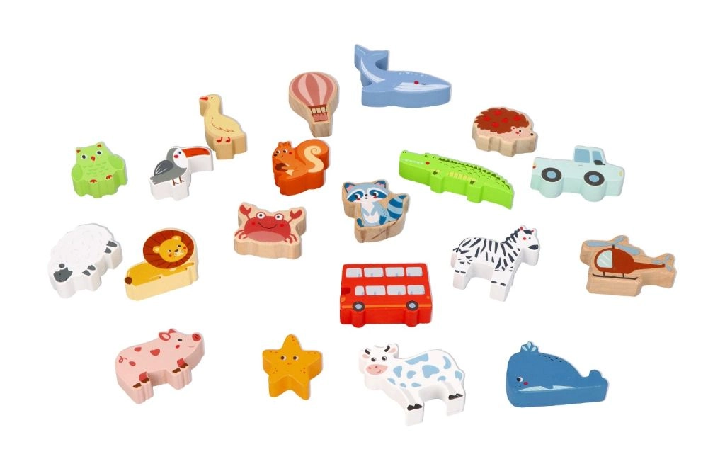 Vastupidavad puidust kujundid loomade, sõidukite ja esemete piltidega innustavad õppima ja loovmängu. Siledad servad on väikestele kätele ohutud.