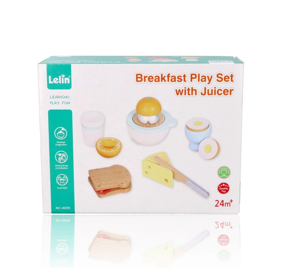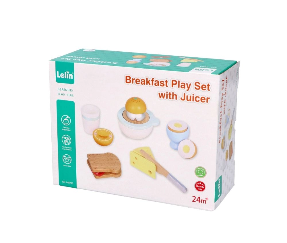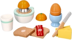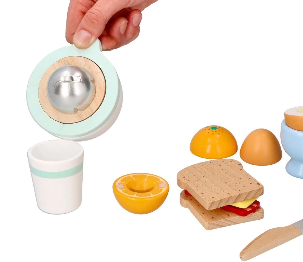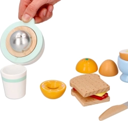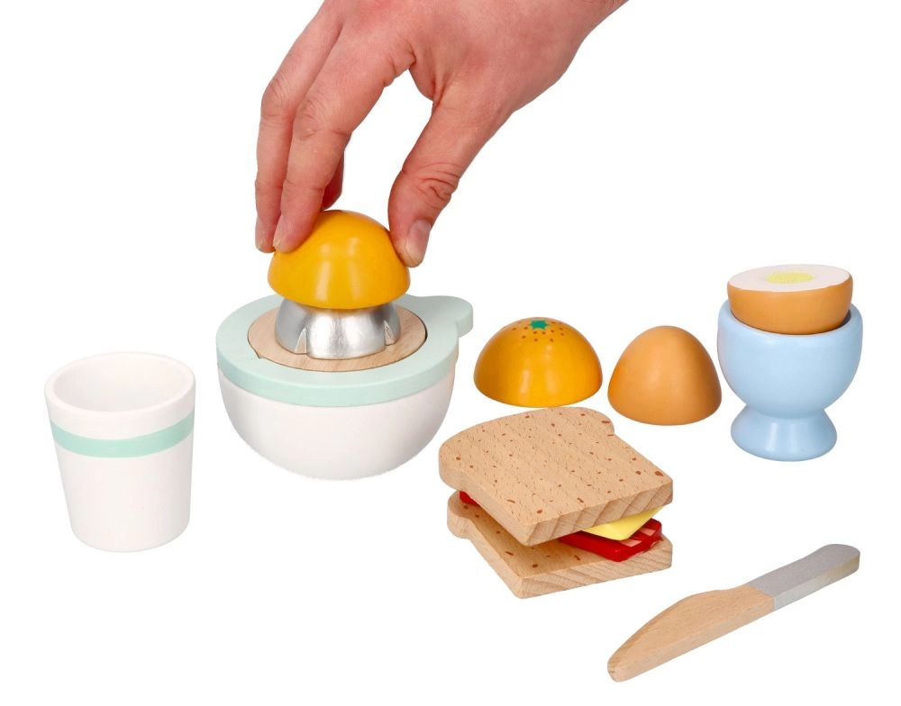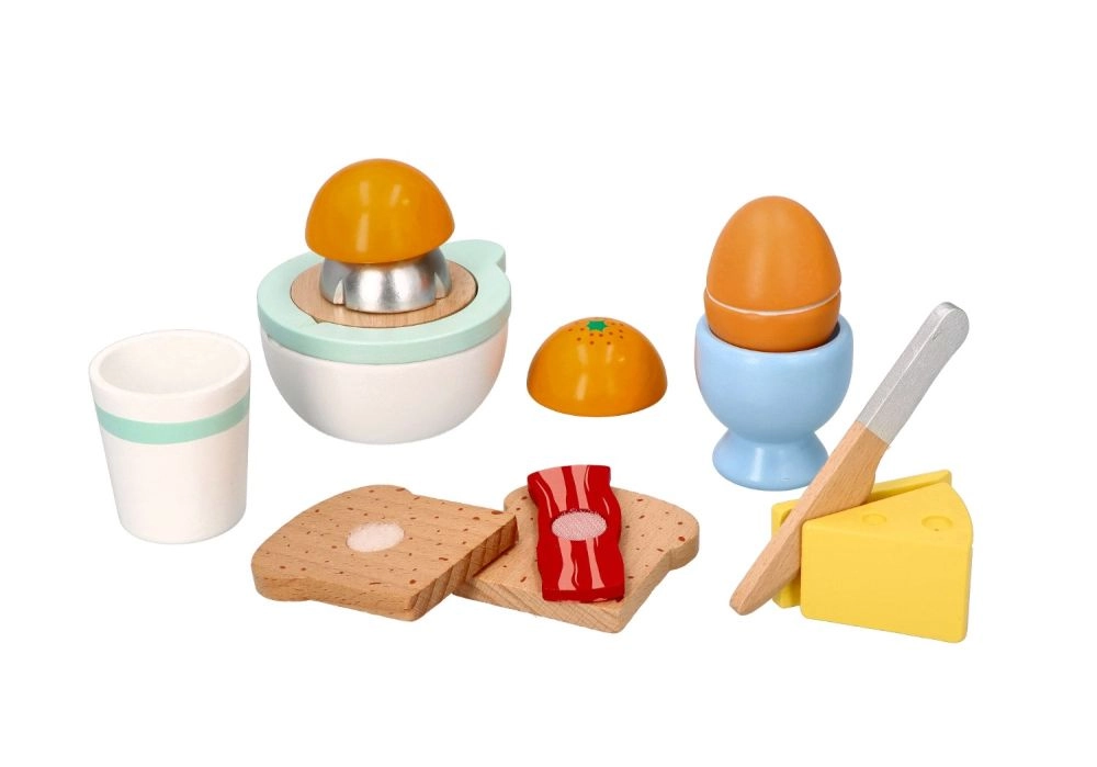 Puidust hommikusöögikomplekt väikestele kokkadele toob kõik realistlikuks kokkamismänguks – röstsaiad, pehme muna tassikeses, juust, käsitsi mahlapress apelsiniga, tass ja ohutu puidust nuga. Alates 24. elukuust arendab peenmotoorikat, loovust ja rollimänge kvaliteetse ja vastupidava teostusega.