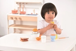 See hoolikalt valmistatud puidust hommikusöögikomplekt on ideaalne esimesteks köögiseiklusteks. Lapsed saavad valmistada oma hommikusöögi – alates saiakeste lõikamisest kuni värske mahla pressimiseni. Realistlikud detailid ja meeldivad pastelsed toonid kutsuvad mängima ja arendavad kujutlusvõimet.