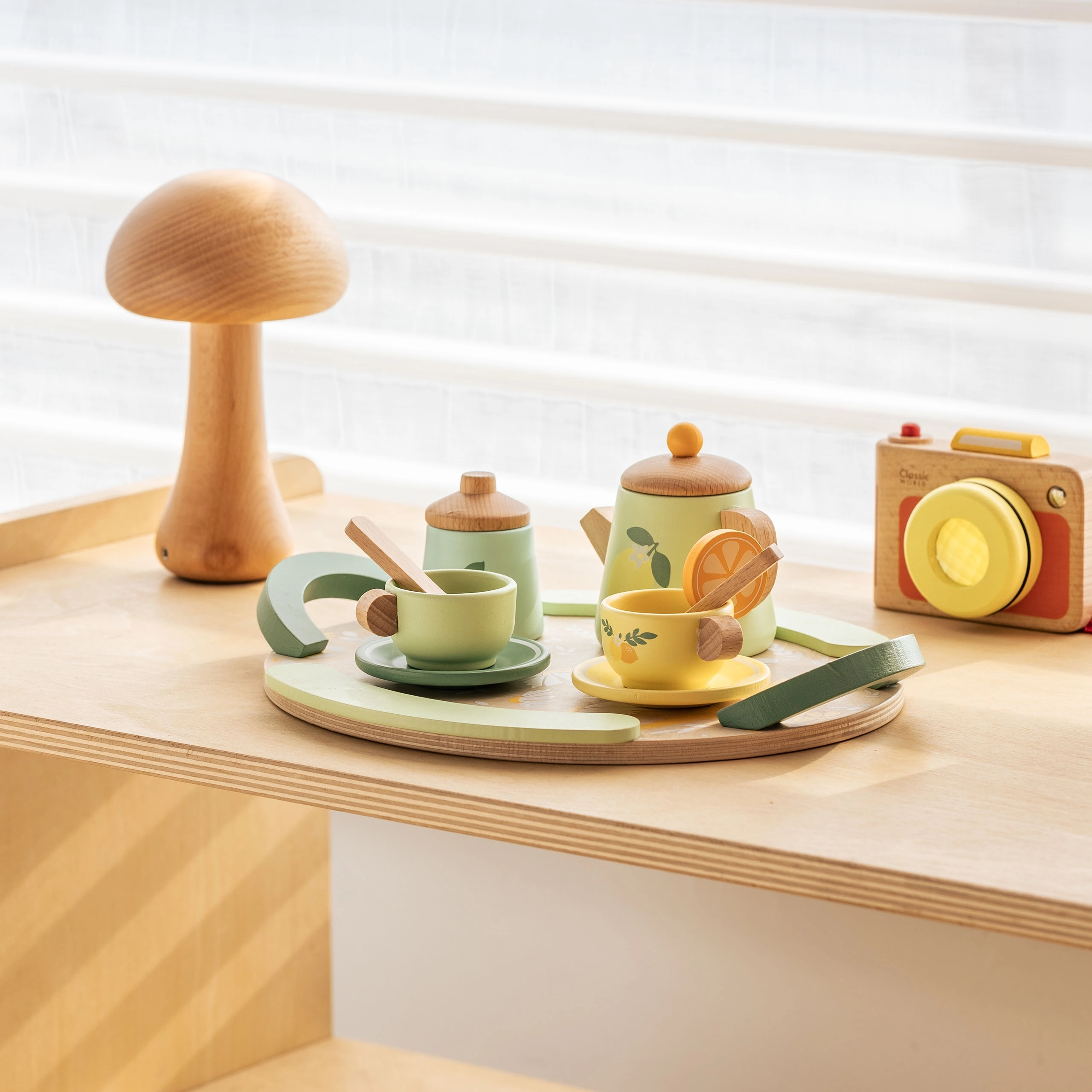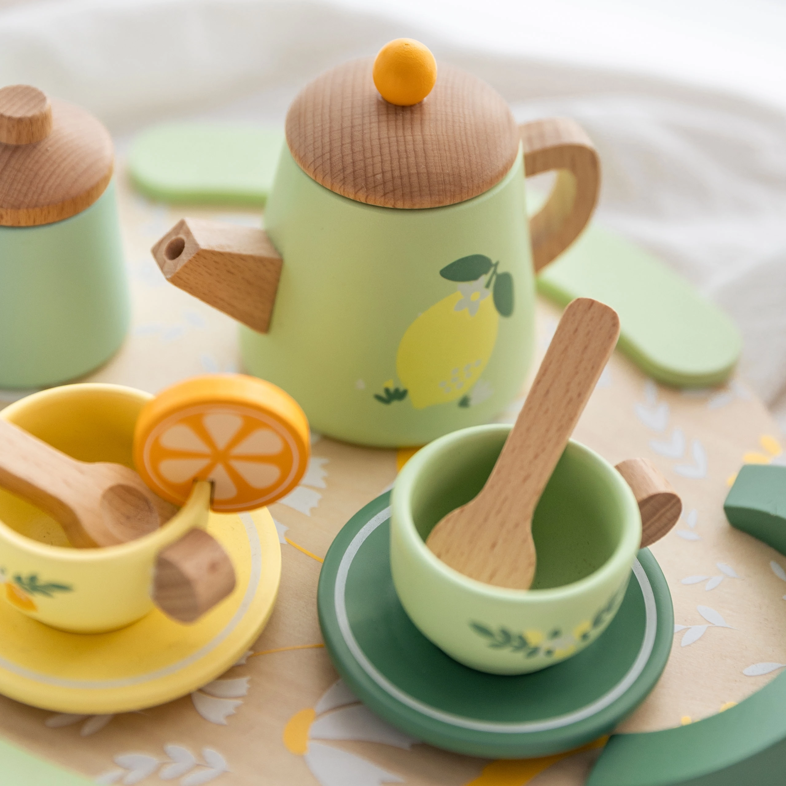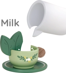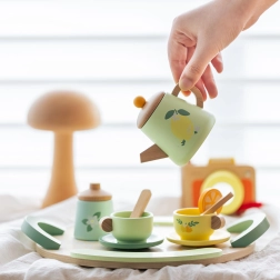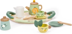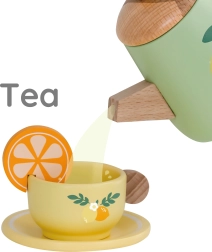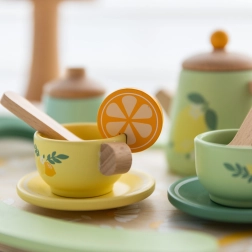 Pakkuge lastele võluvat teeseremooniat elegantse puidust komplektiga õrnvärvilistes pastelltoonides. Komplekti kaunistavad puuvilja- ja lillemotiivid ning see sisaldab kannu, tasse alustaldrikutega, lusikaid, piima- ja suhkrutoosi ning suurt käepidemetega kandikut lihtsaks kandmiseks.