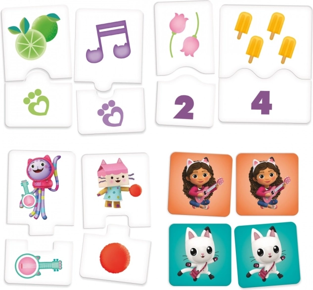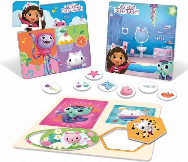 Gabby võlumaailma maja teemalised plaadid ja illustratsioonid innustavad lapsi avastama numbreid, esemeid ja lihtsaid reegleid mängu käigus.