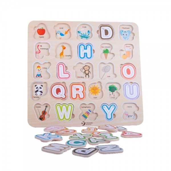 Lõbus ja samas hariv mäng pisipõnnidele: värviline puidust tähestiku nupp-pusle arendab peenmotoorikat, loogikat ja tähtede tundmist. Iga tähe all on pilt inglise keeles, tänu millele omandavad lapsed loomulikul moel inglise keele algteadmisi juba varakult.