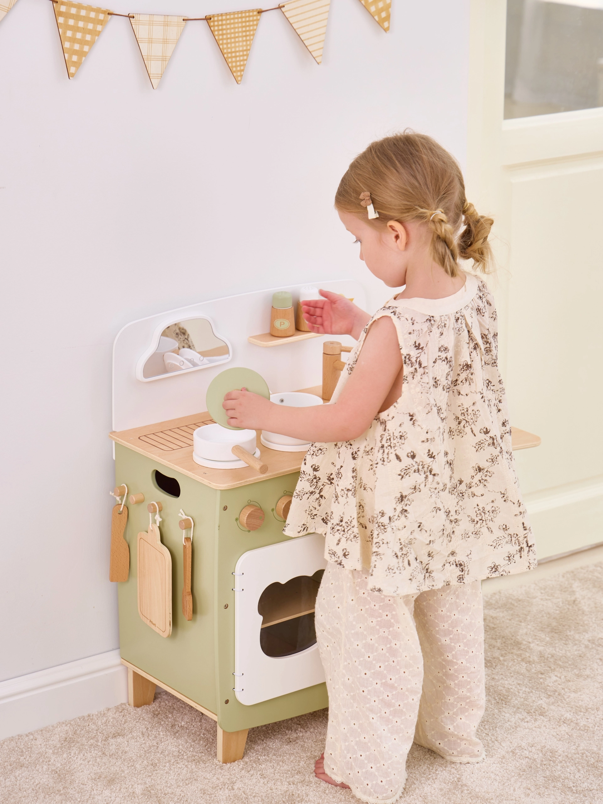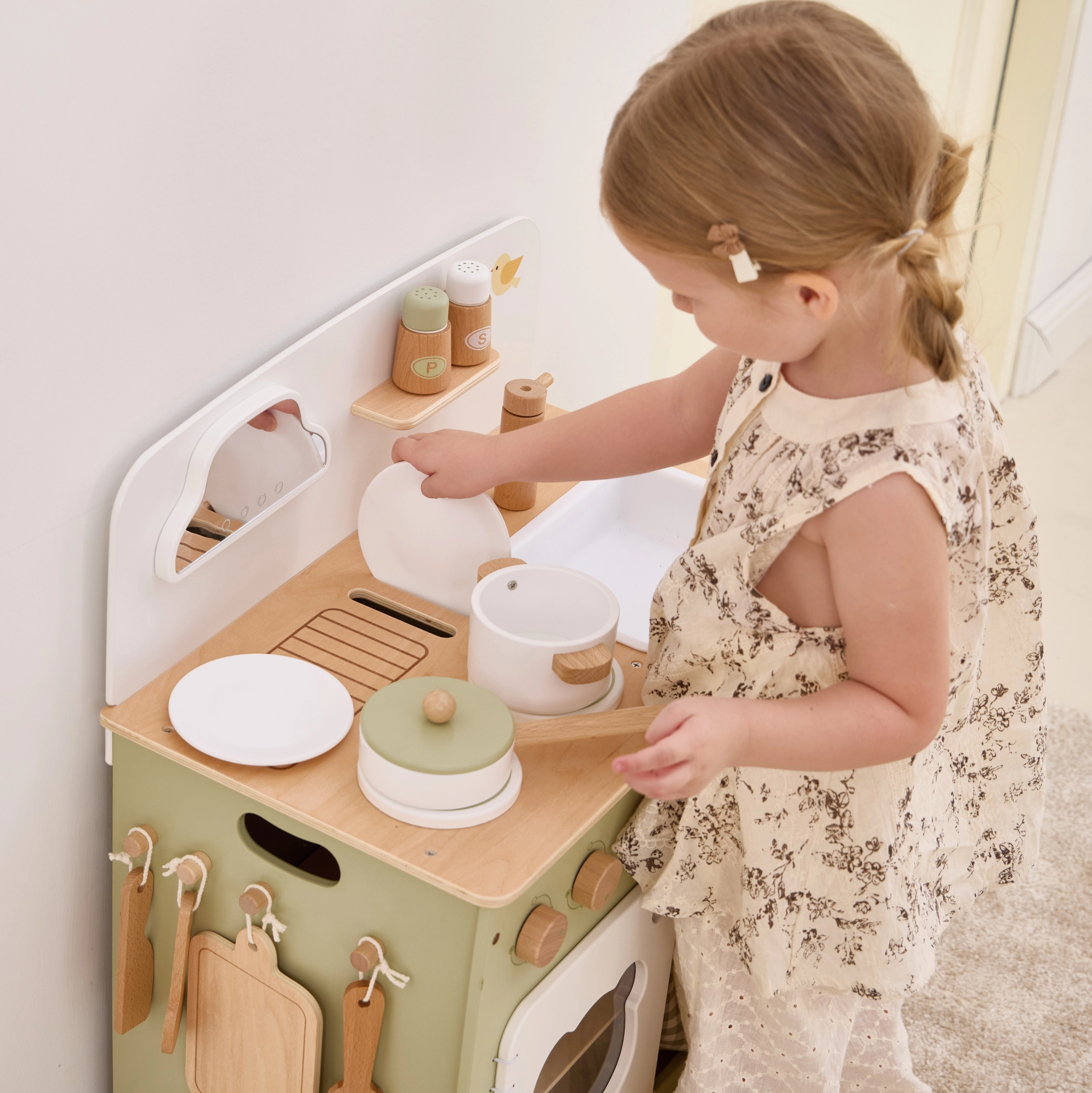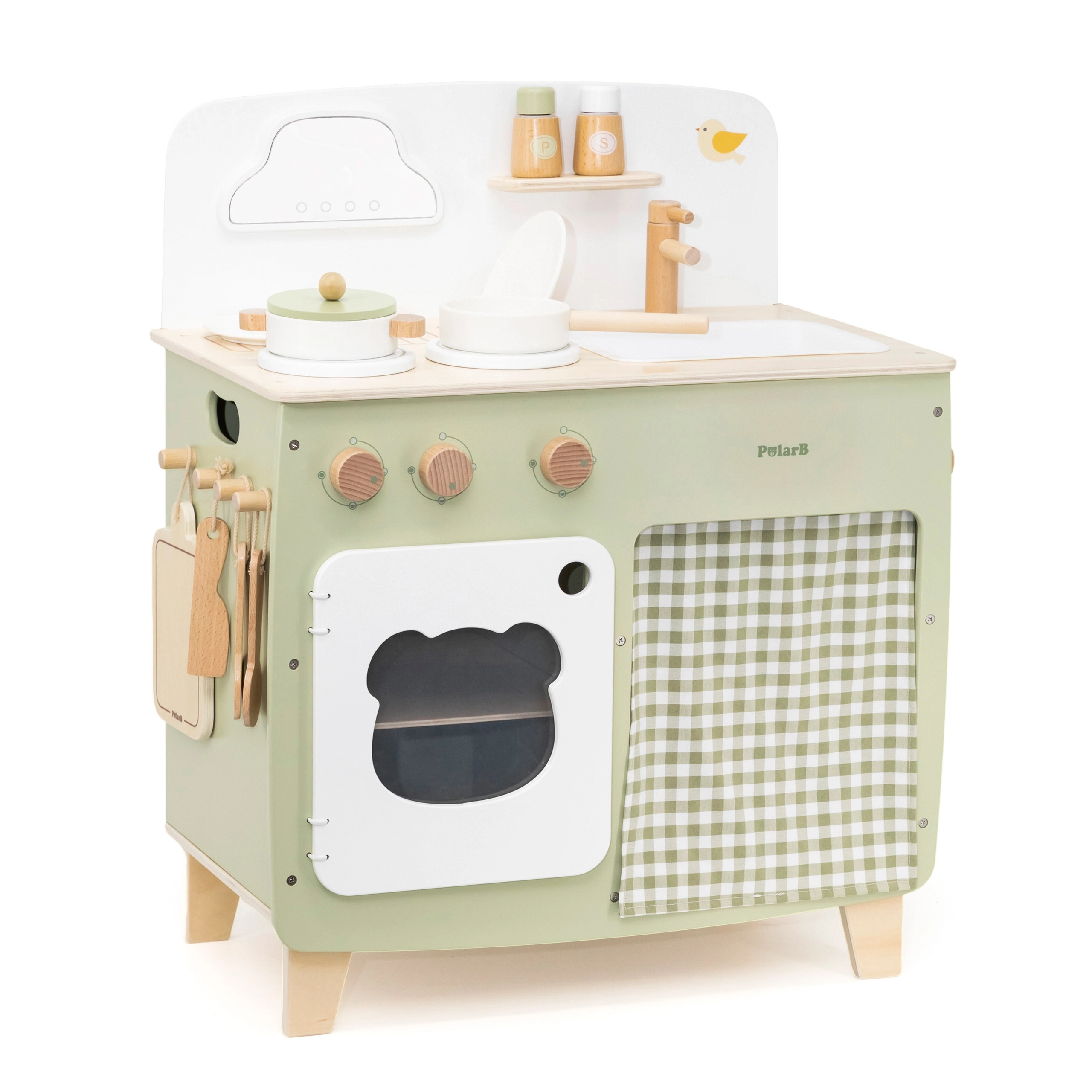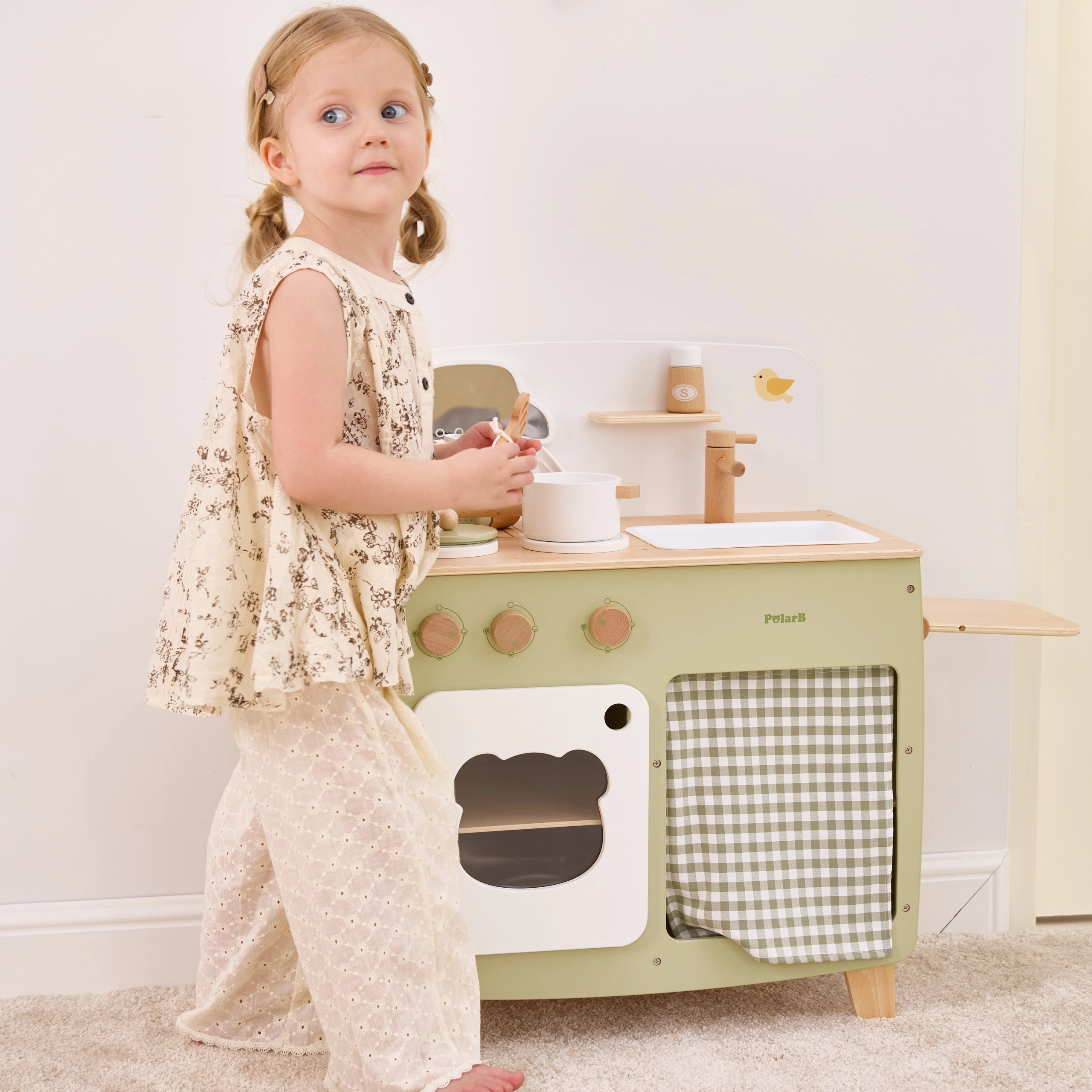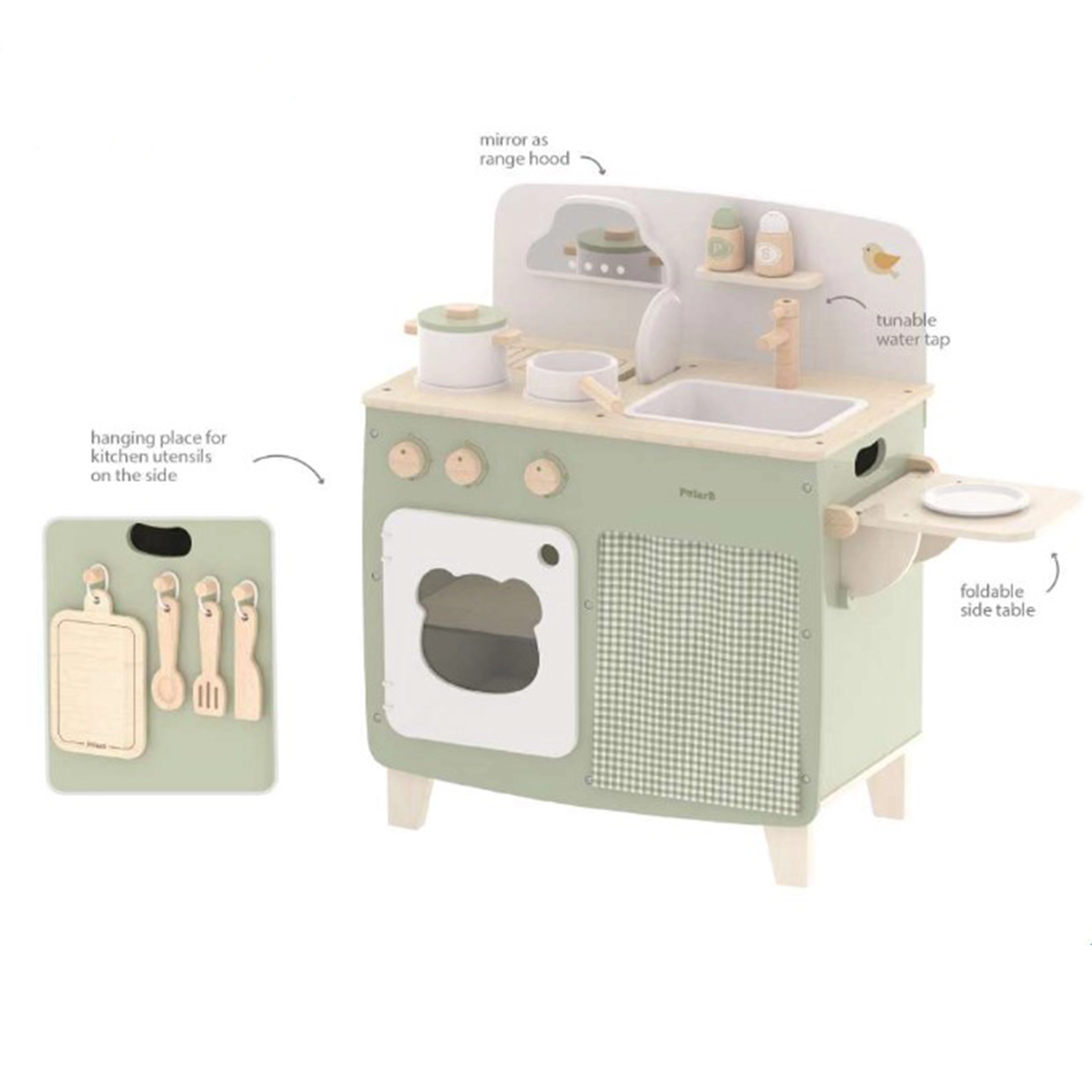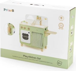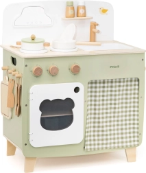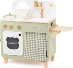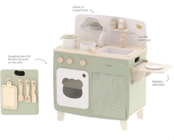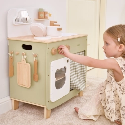 Stiilne lastesöök köök meeldivates looduslikes ja rohekates toonides pakub lastele realistlikku kokanduskogemust. Tänu vastupidavale puidust teostusele, pööratavatele nuppudele, valamu- ja ahjumoodulile saavad väiksed kokad nautida tunde turvalist ja loovat mängu. Praktiline klapitav külgpult laiendab tööpinda lõikamiseks või serveerimiseks, samas kui kapp kardina taga peidab kõik aarded.