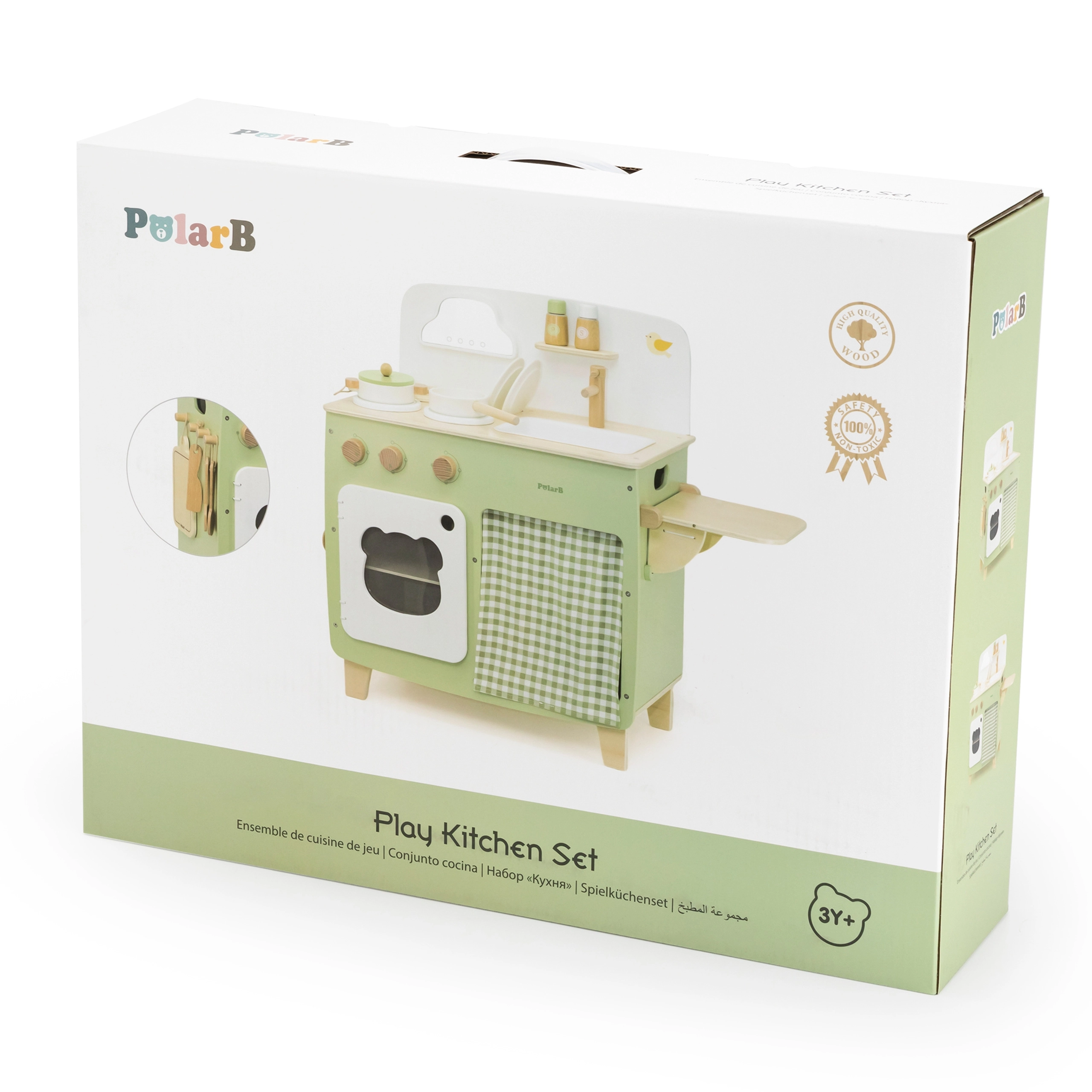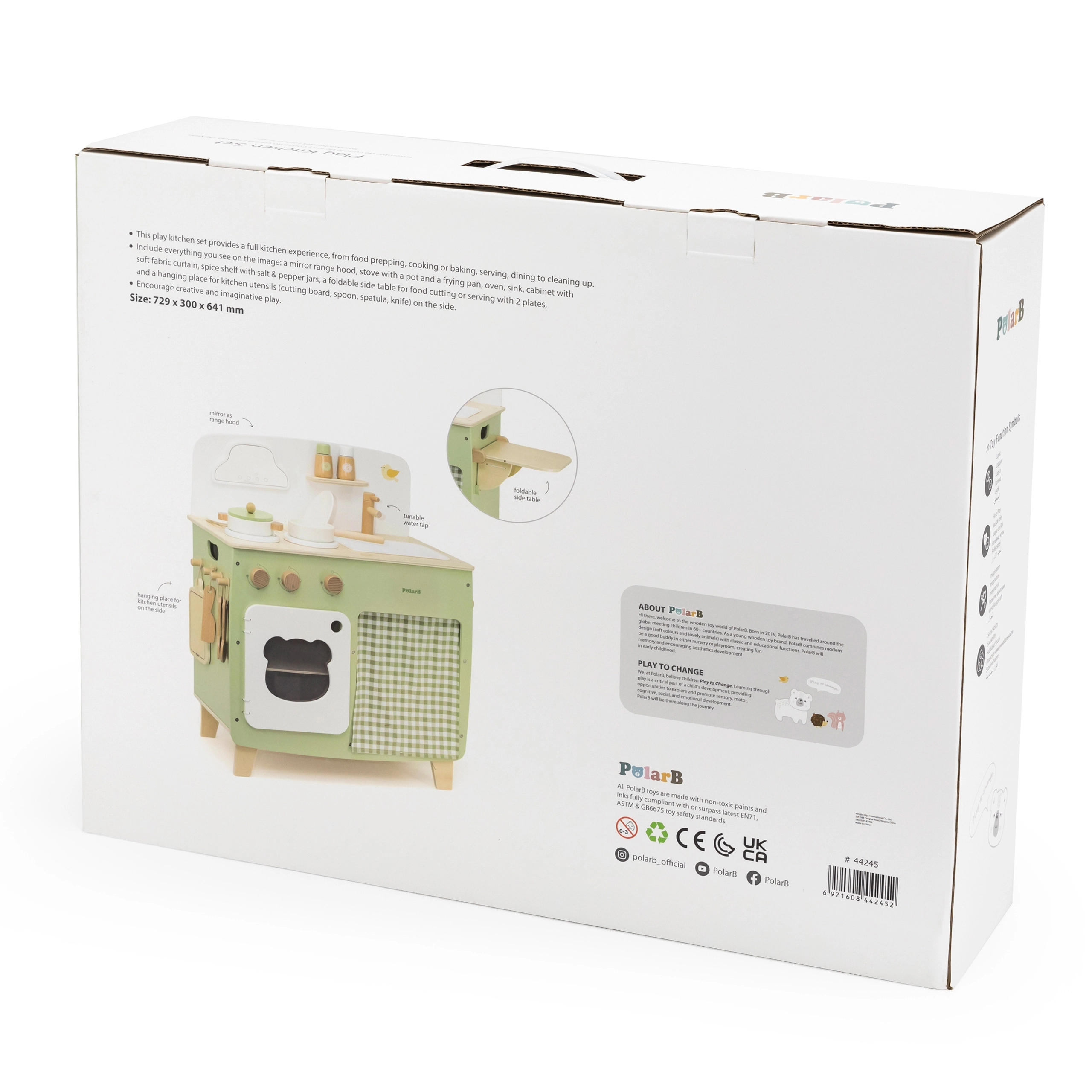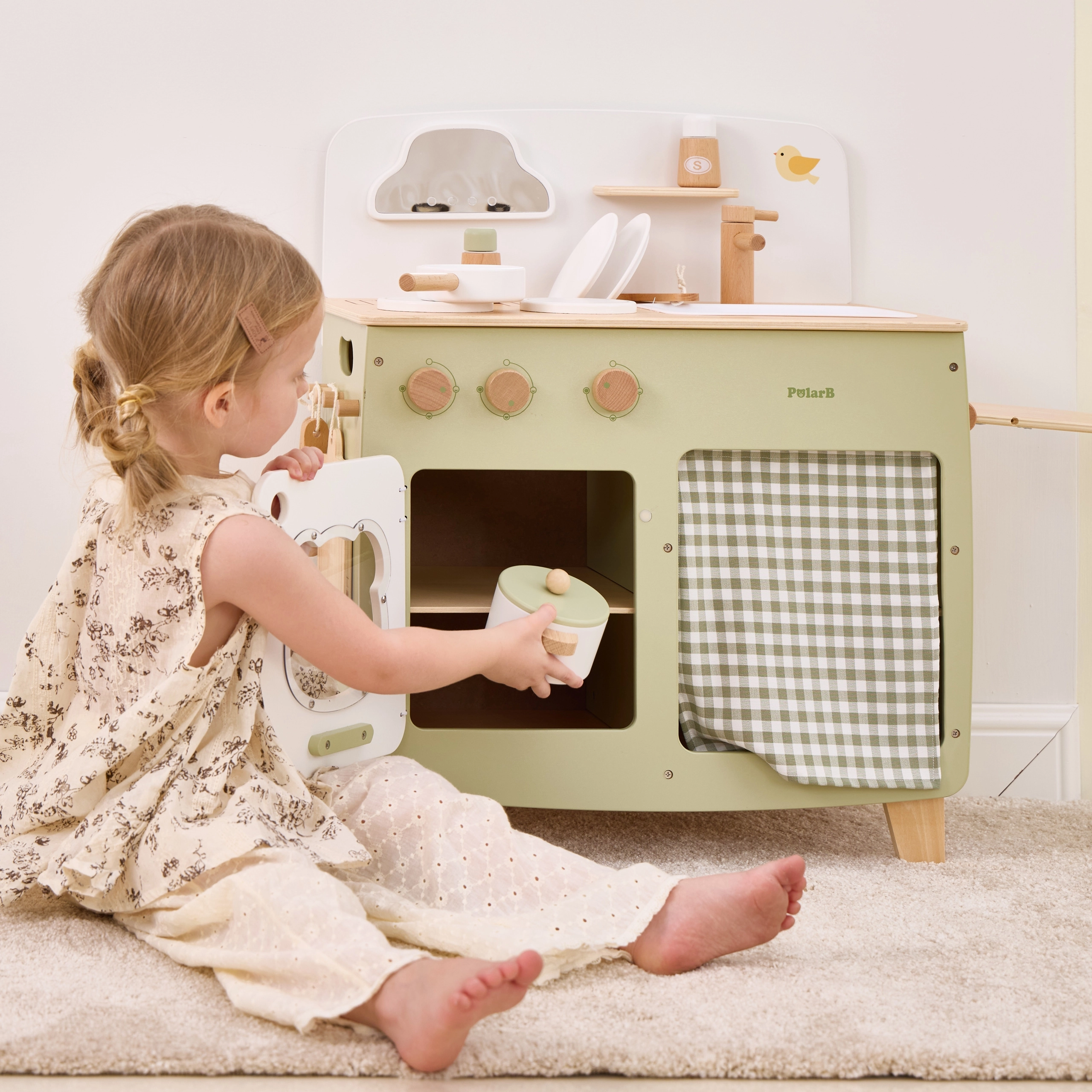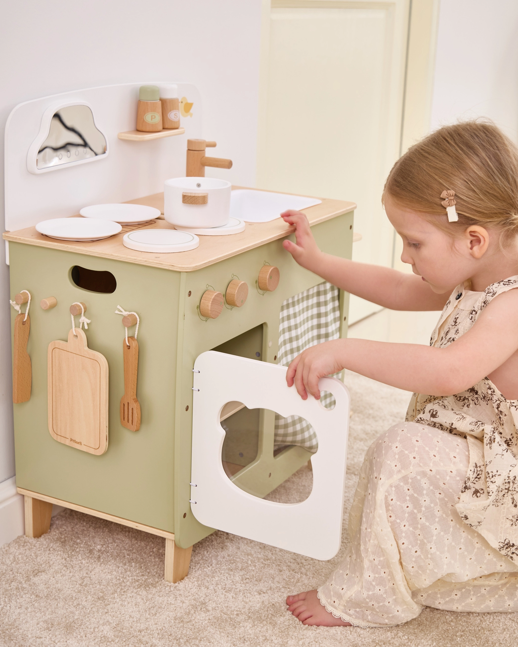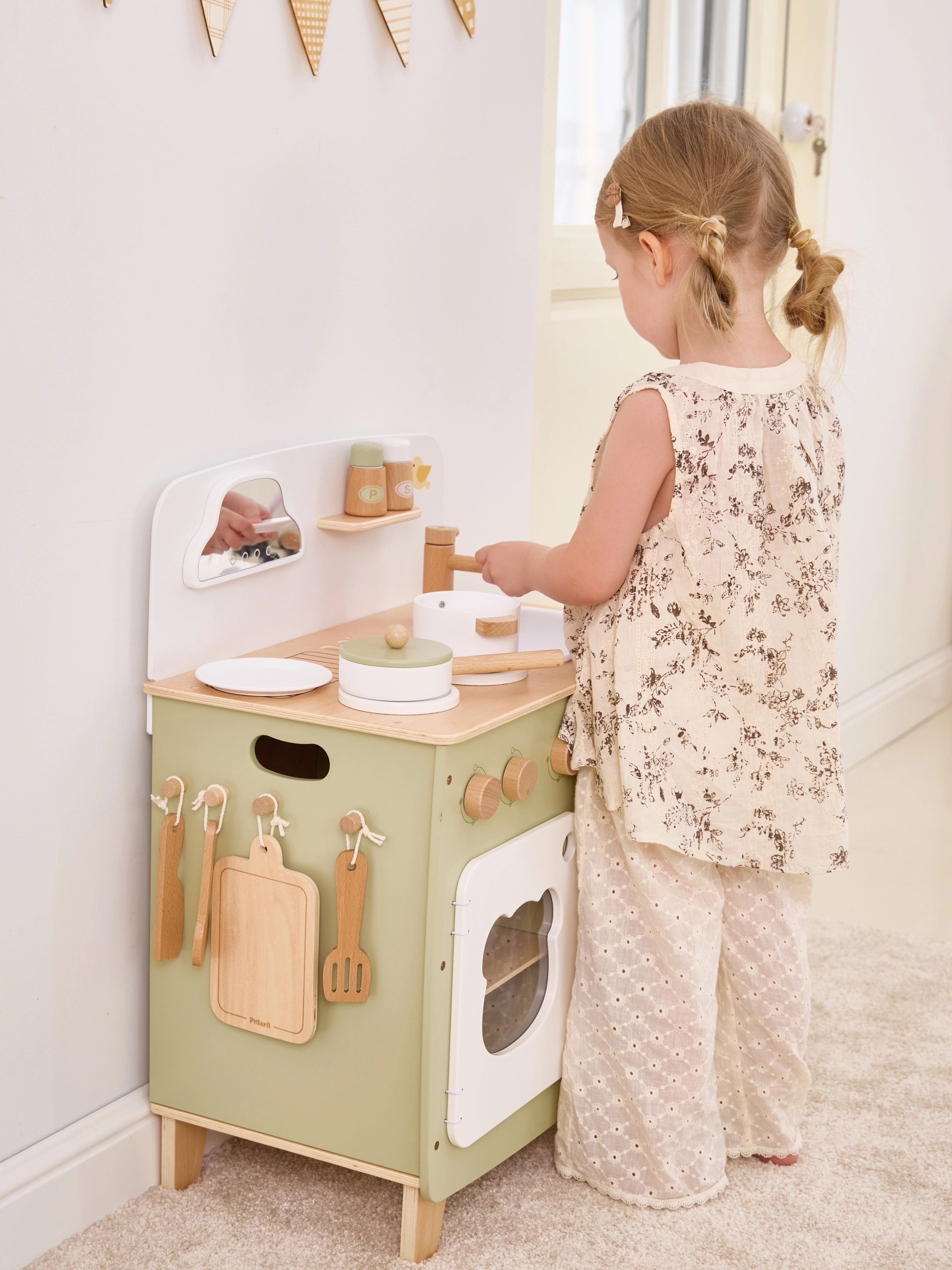 Stiilne lastesöök köök meeldivates looduslikes ja rohekates toonides pakub lastele realistlikku kokanduskogemust. Tänu vastupidavale puidust teostusele, pööratavatele nuppudele, valamu- ja ahjumoodulile saavad väiksed kokad nautida tunde turvalist ja loovat mängu. Praktiline klapitav külgpult laiendab tööpinda lõikamiseks või serveerimiseks, samas kui kapp kardina taga peidab kõik aarded.