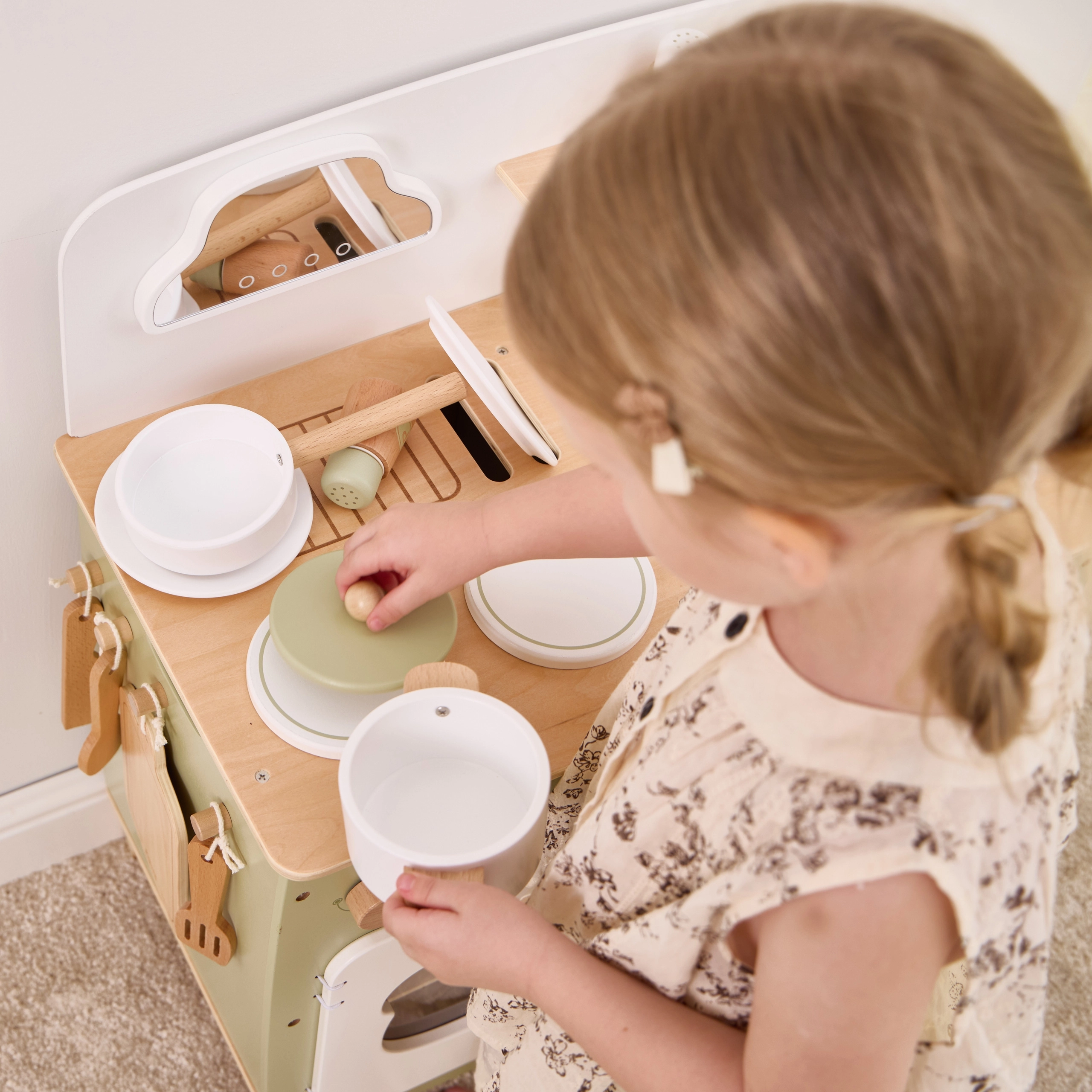 Pööratavad nupud pliidil ja ahjul, valamusegisti, konksud tööriistadele ja vürtsitopsid toetavad matkivat mängu ja peenmotoorikat.
