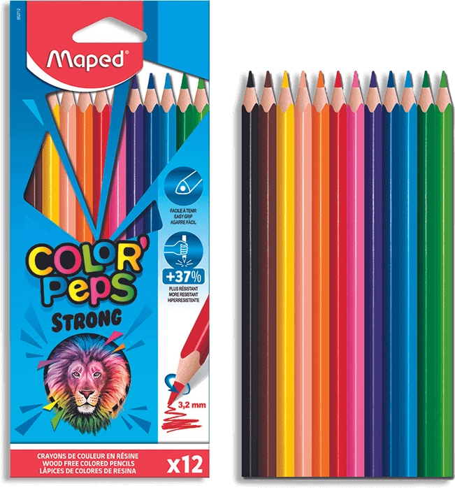 Maped Color'Peps Strong värvipliiatsid pakuvad erksaid ja selgeid värve ning erakordselt vastupidavat südamikku. Kolmnurkne korpus tagab mugava haarde, sobib hästi lastele.