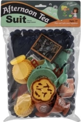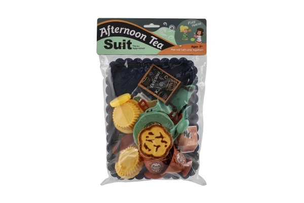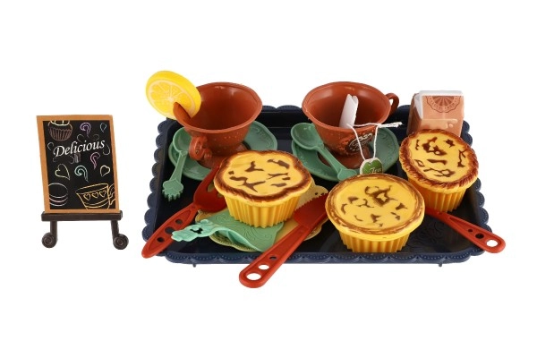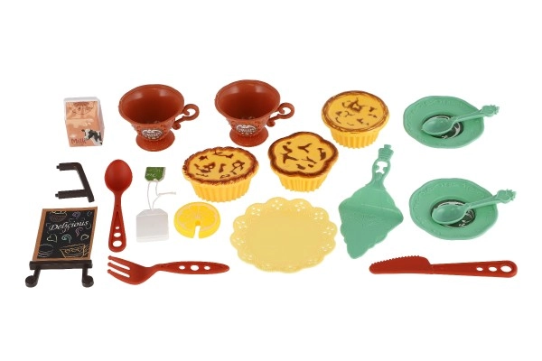Komplektis on tassid, taldrikud, söögiriistad, väike magustoit ja sildike kirjaga – kõik vajalik stiilseks serveerimiseks ja seltskondlikuks rollimänguks.