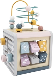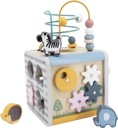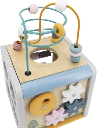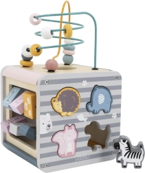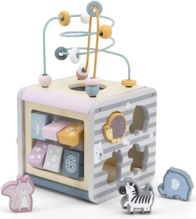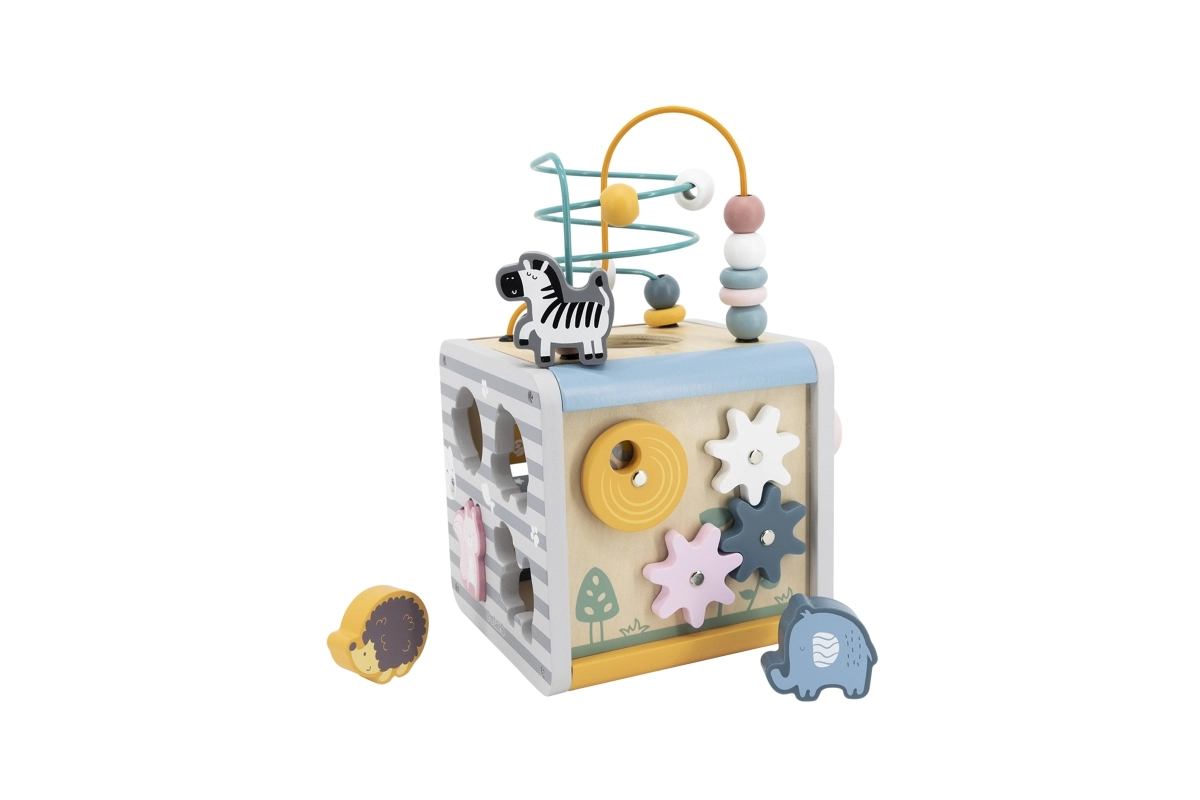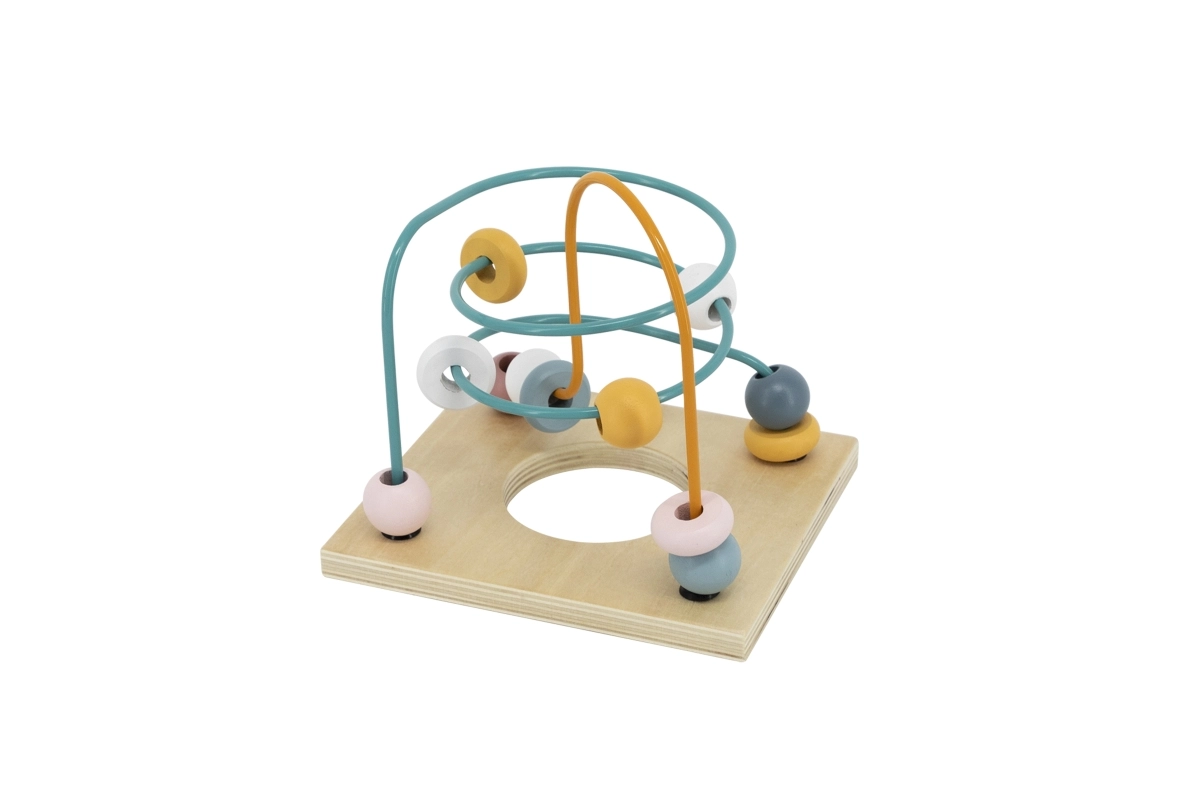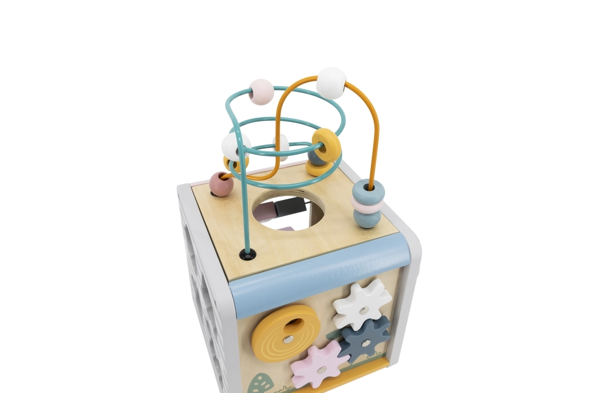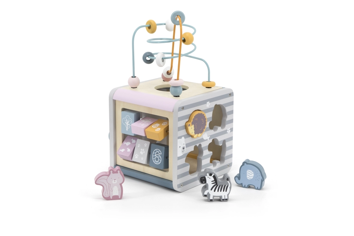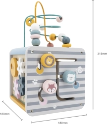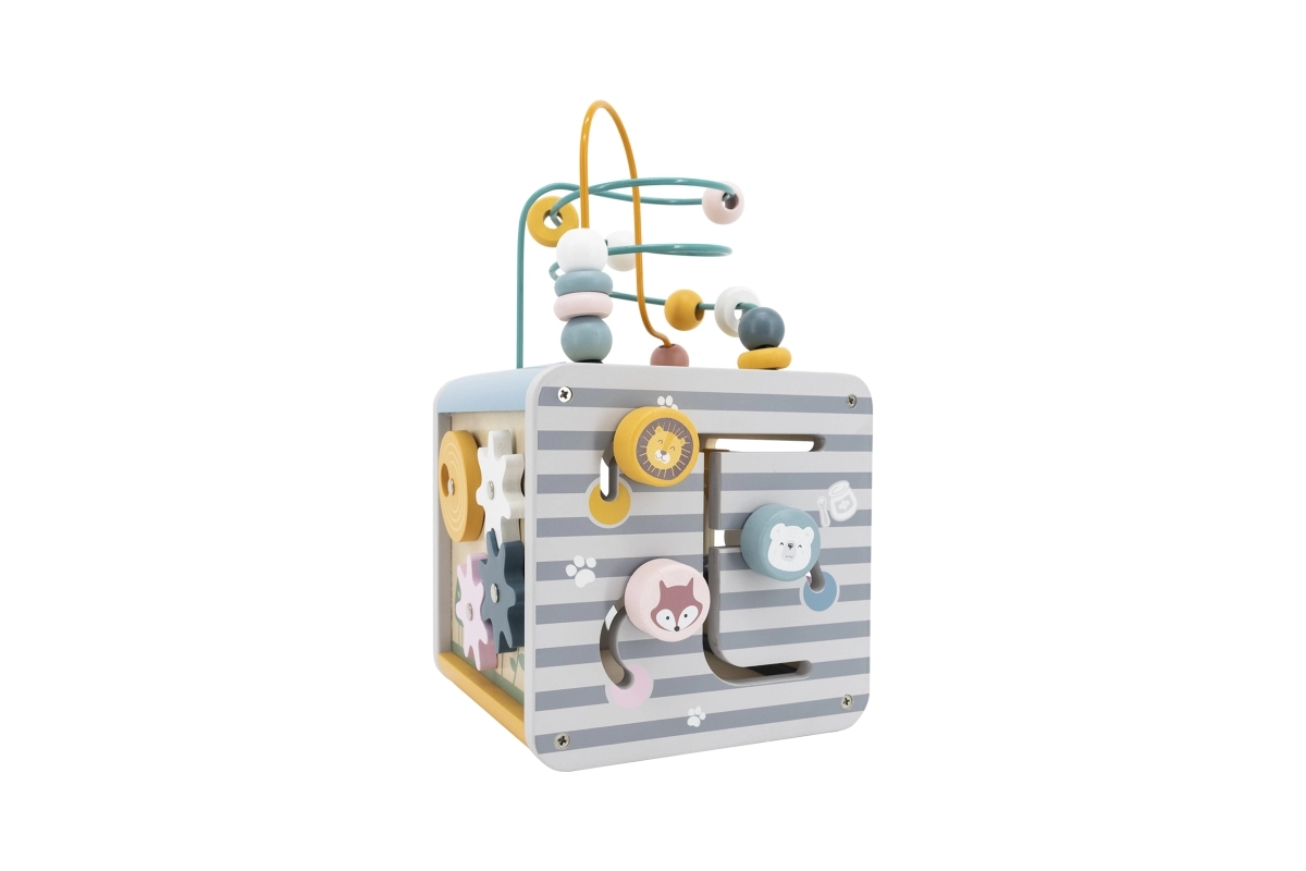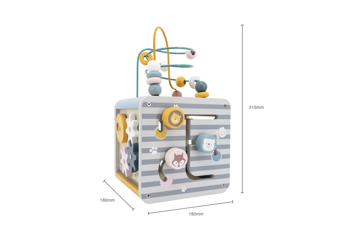Ülaosas on traadist helmeste labürint peenmotoorika ja kannatlikkuse arendamiseks. Külgseintel on loomakujunditega sorteerija, pööratavad numbrikuubikud esimesteks loendusharjutusteks, hammasrattad põhjus‑tagajärg seoste mõistmiseks ning liugurid koordinatsiooni treenimiseks.