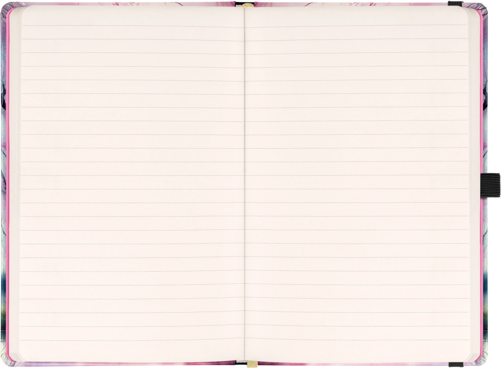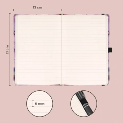 Elegantne jooneline märkmik NOTIQUE Sakura praktilises formaadis 13 × 21 cm, tugevate kaantega, kummipaelaga sulgemine, pliiatsihoidik ja sisemine tasku. Pakub 172 lehte meeldival kollasel paberil nii päevikuks kui tööalasteks märkmeteks.