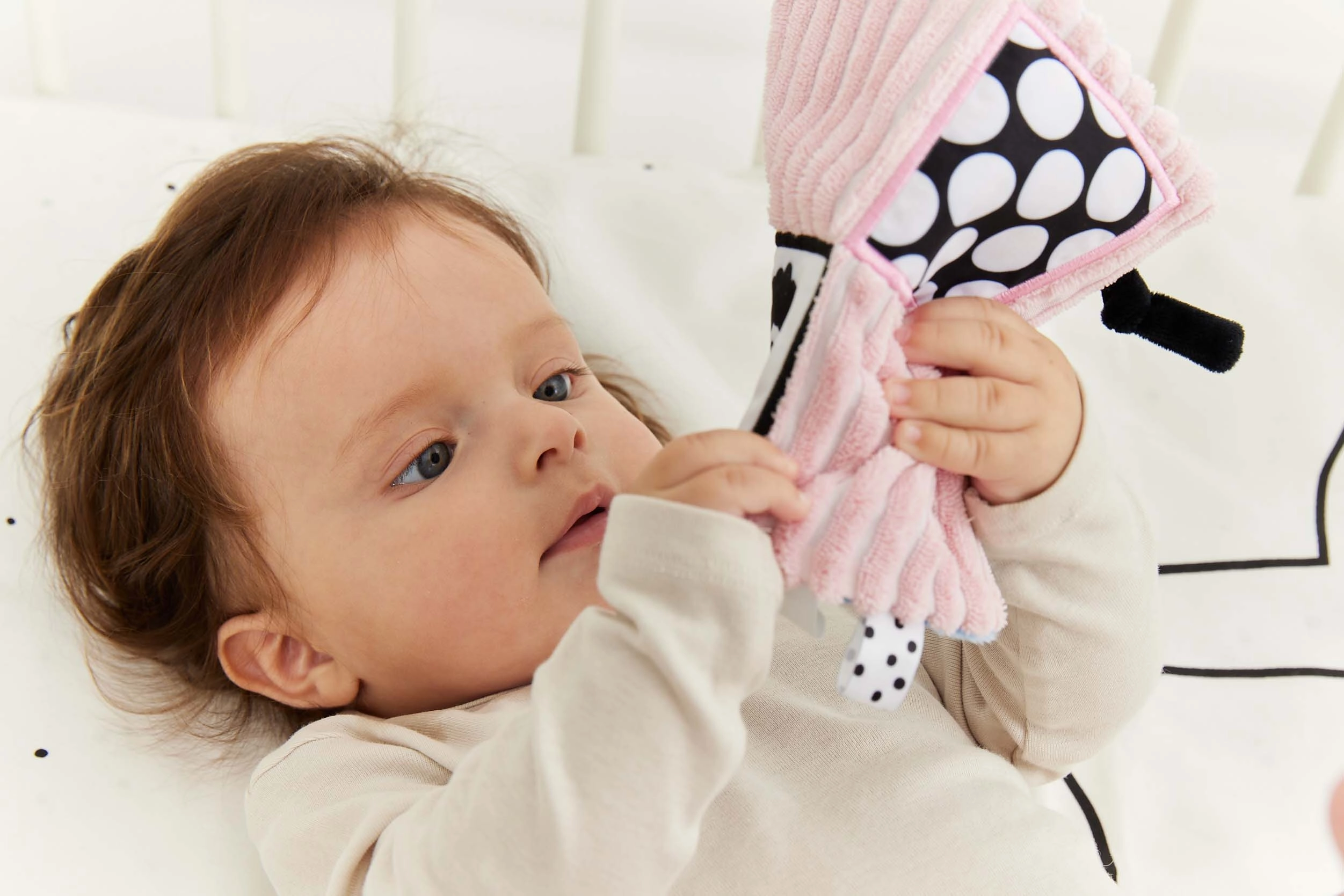 Tekk kasutab erksaid kontrastseid värve ja mustreid, et stimuleerida lapse nägemist ja toetada visuaalset huvi.
