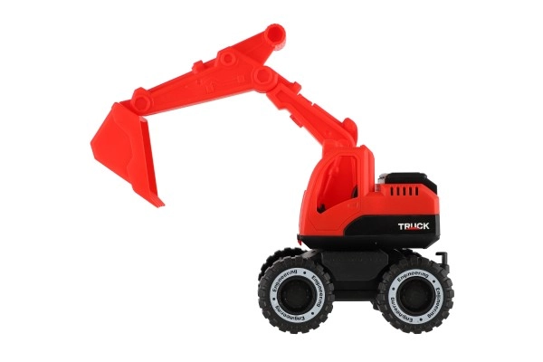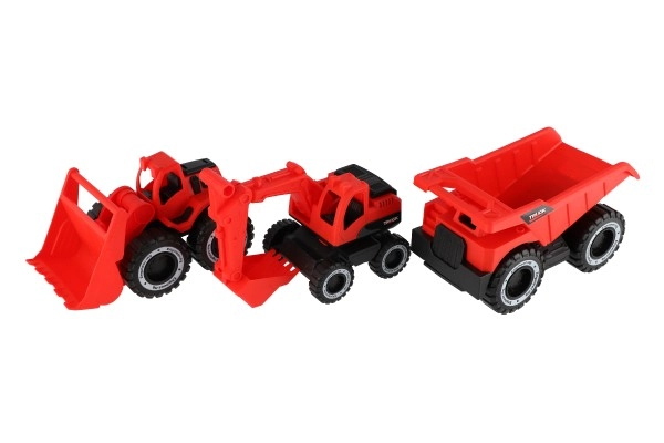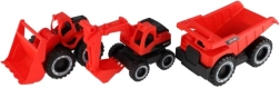 Komplektis on ekskavaator, laadur ja kastiauto – ideaalne kooslus kaevamiseks, materjali teisaldamiseks ja koorma kallutamiseks.