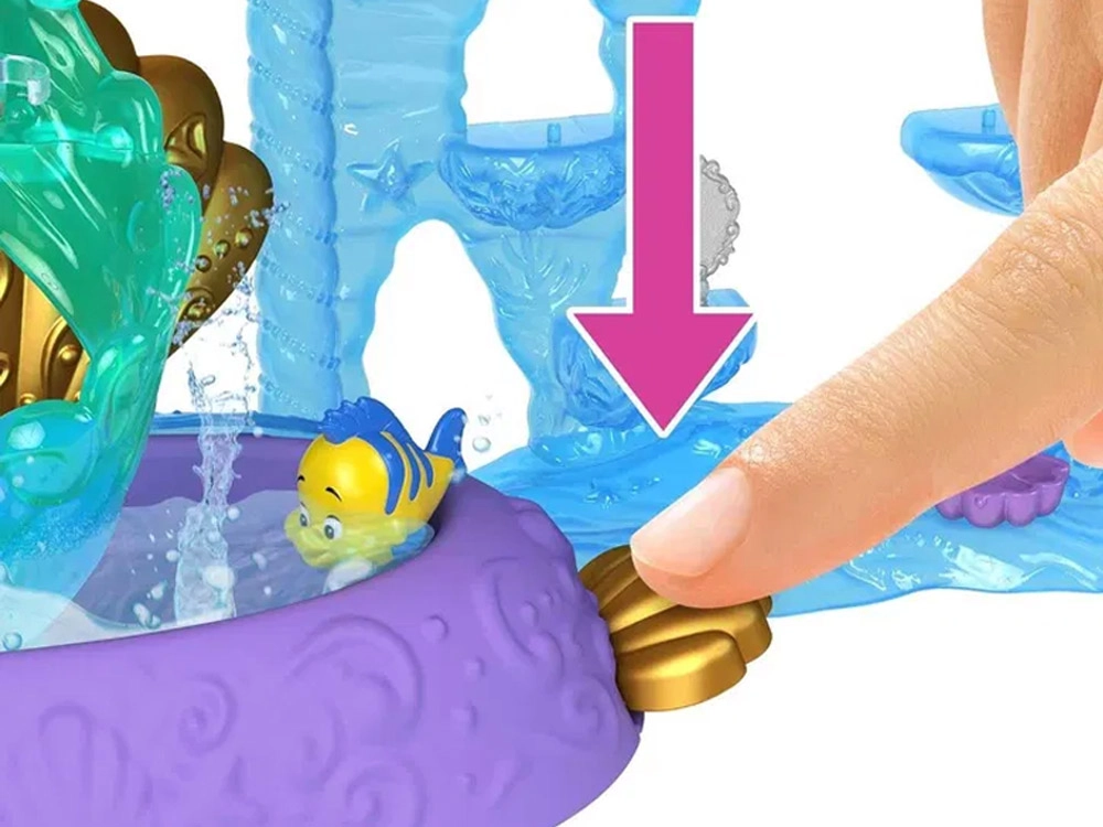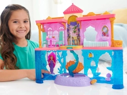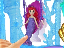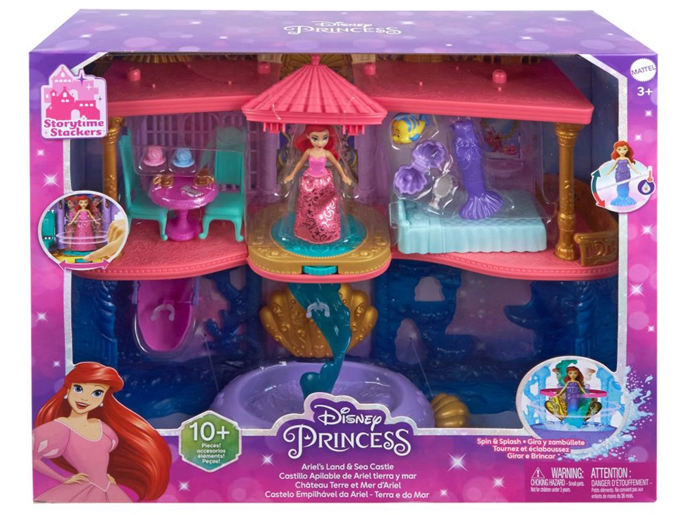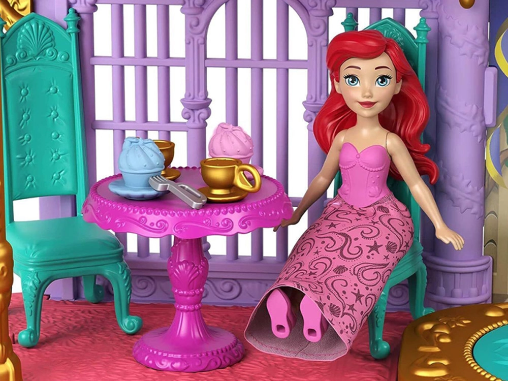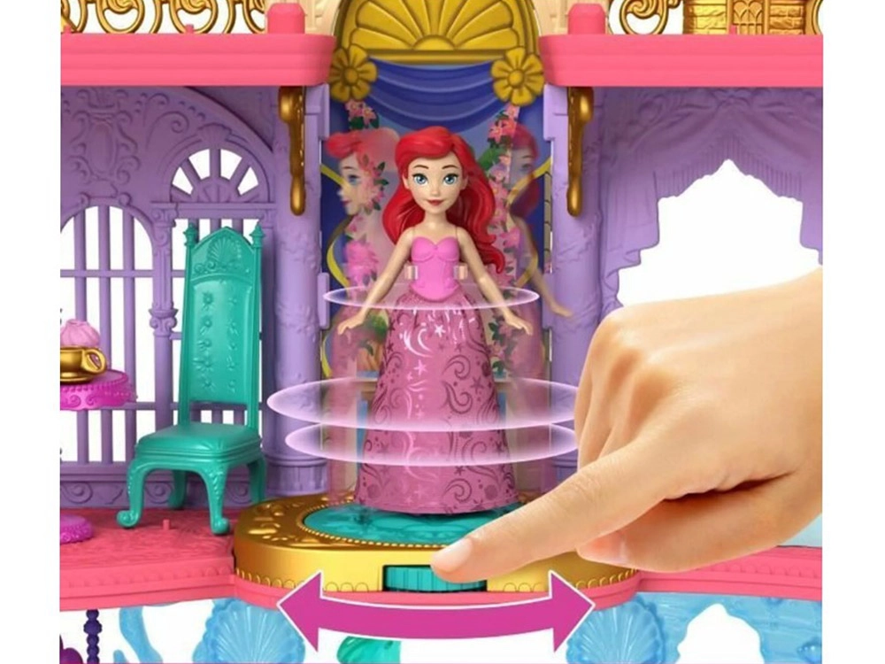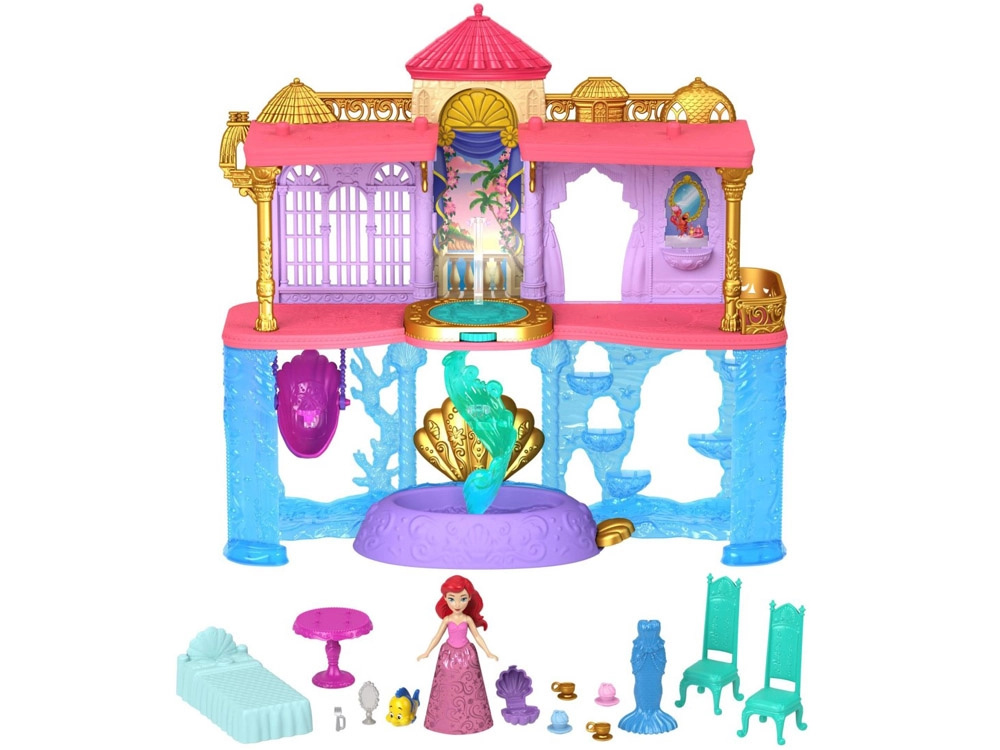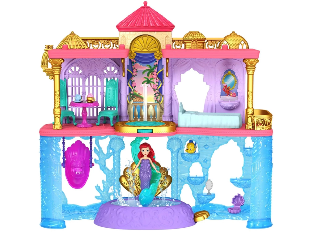 Avastage Disney printsess Arieli võlumaailm kahekorruselise paleega, mis ühendab maa- ja veealuse kuningriigi. Lapsed naudivad 6 mänguala, pöörlevat tantsuplatvormi, söögituba, magamistuba ning veealust basseinikest mullinupuga. Komplektis on Ariel nukk välimuse muutmisega – roosa kleit ja sooja veega värvi muutev saba – lõpututeks lugudeks ja loovmänguks.