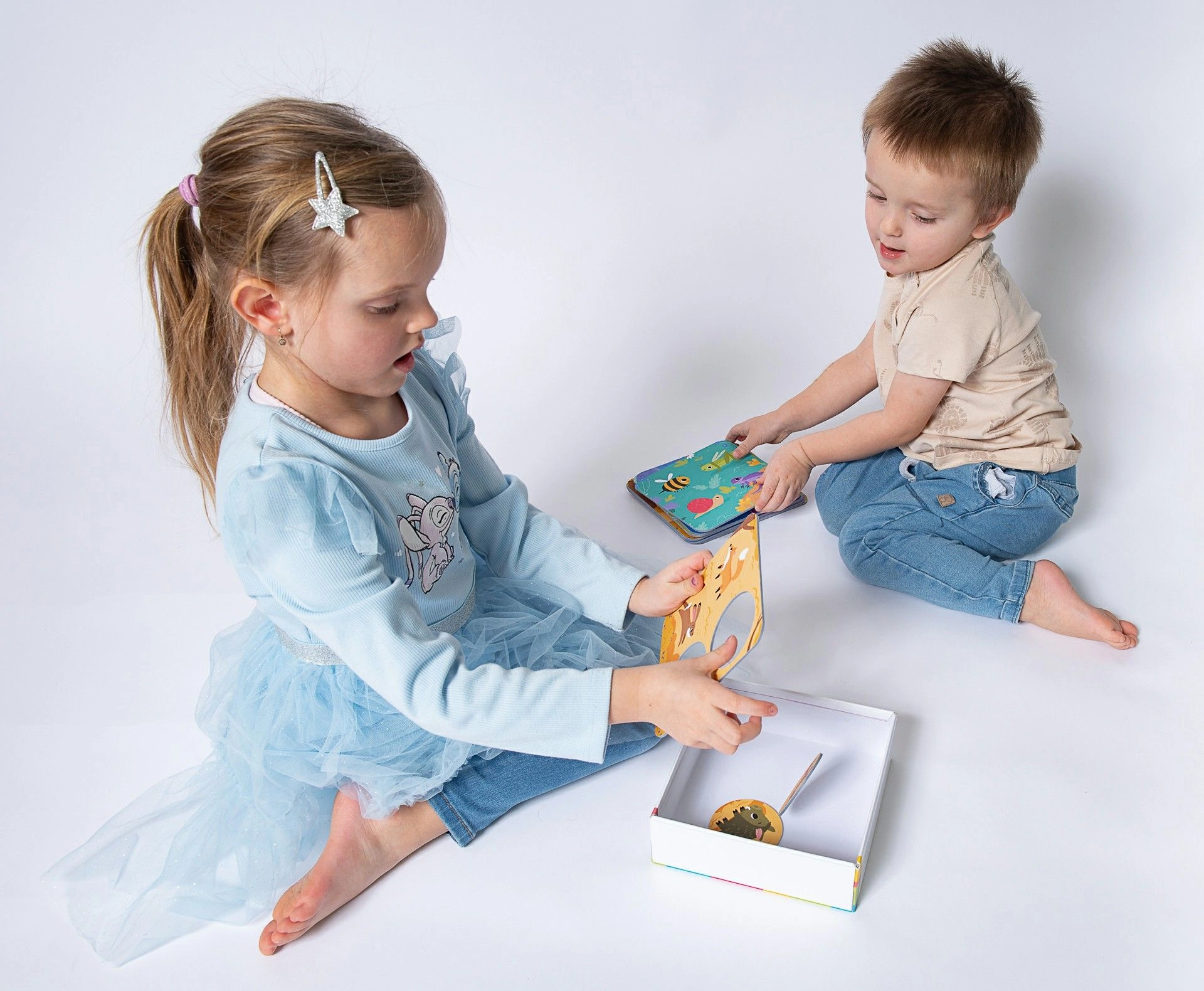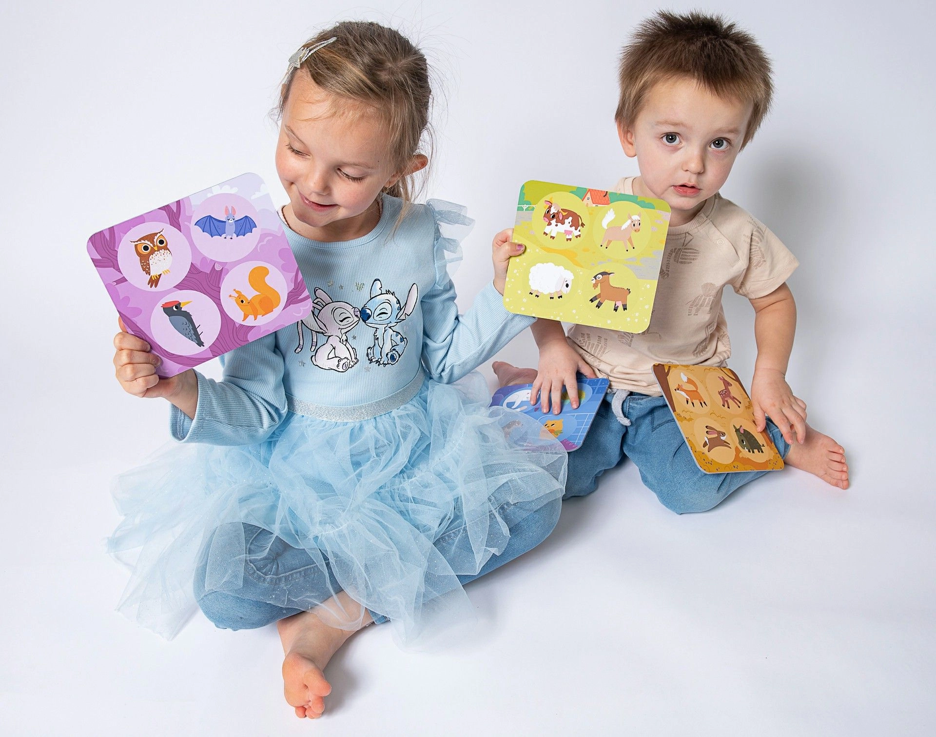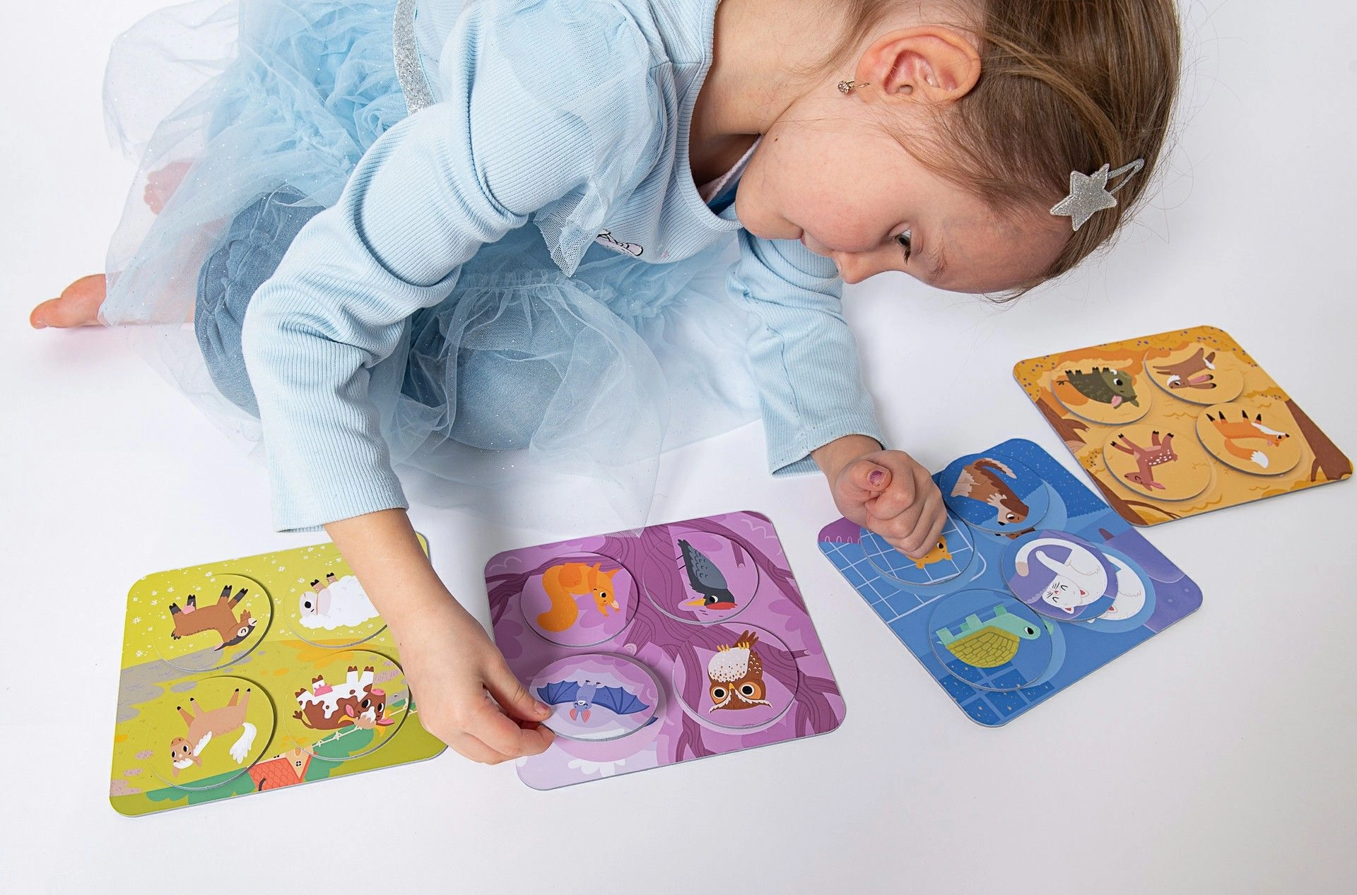 Lapsed õpivad mänguliselt tundma 24 looma ja sobitama need õigete elupaikadega – kodus, niidul, metsas või vees. Suurepärane sõnavara arendamiseks ja ümbritseva maailma mõistmiseks.