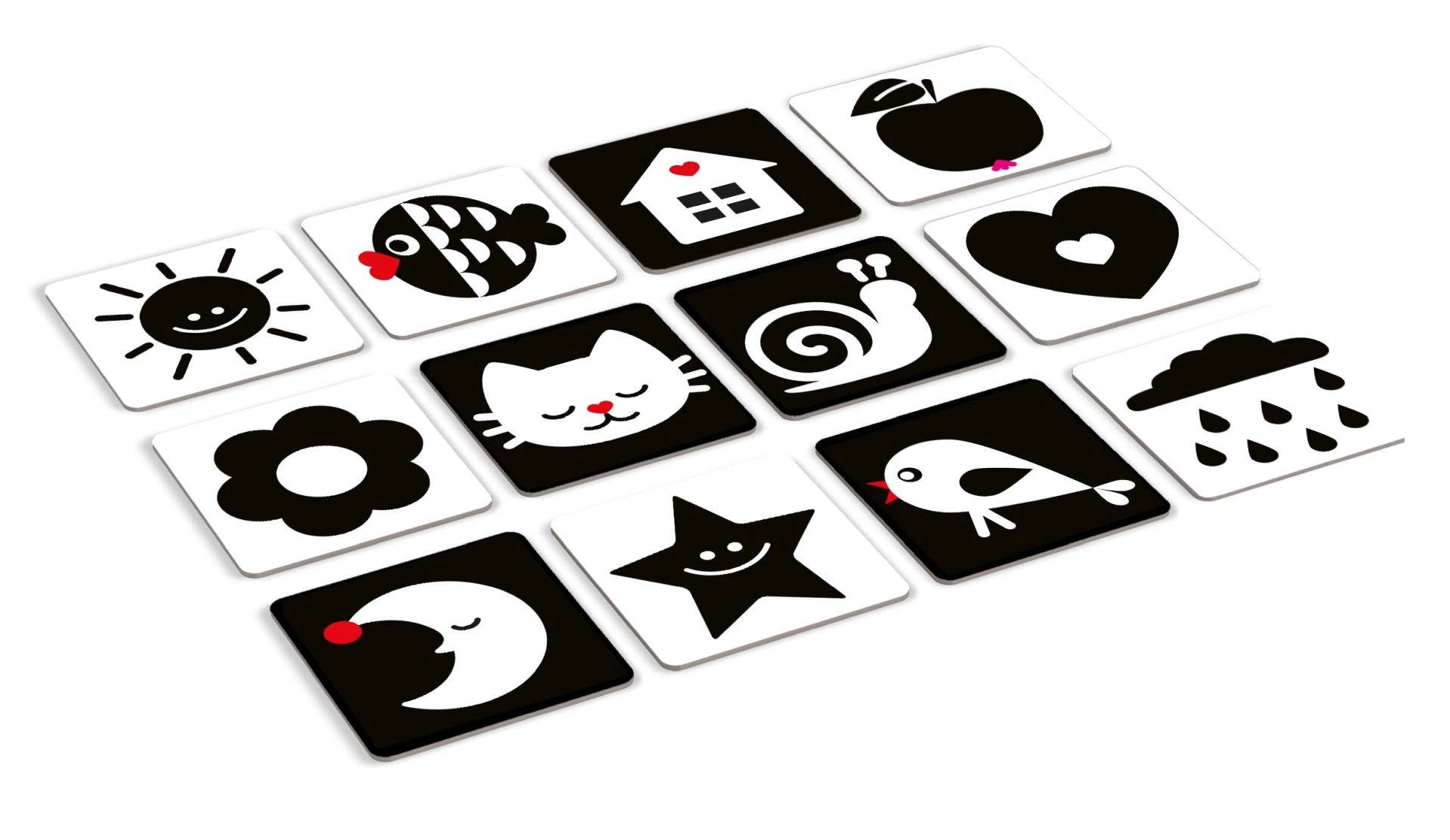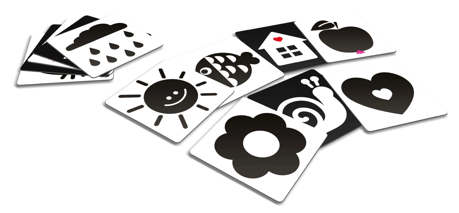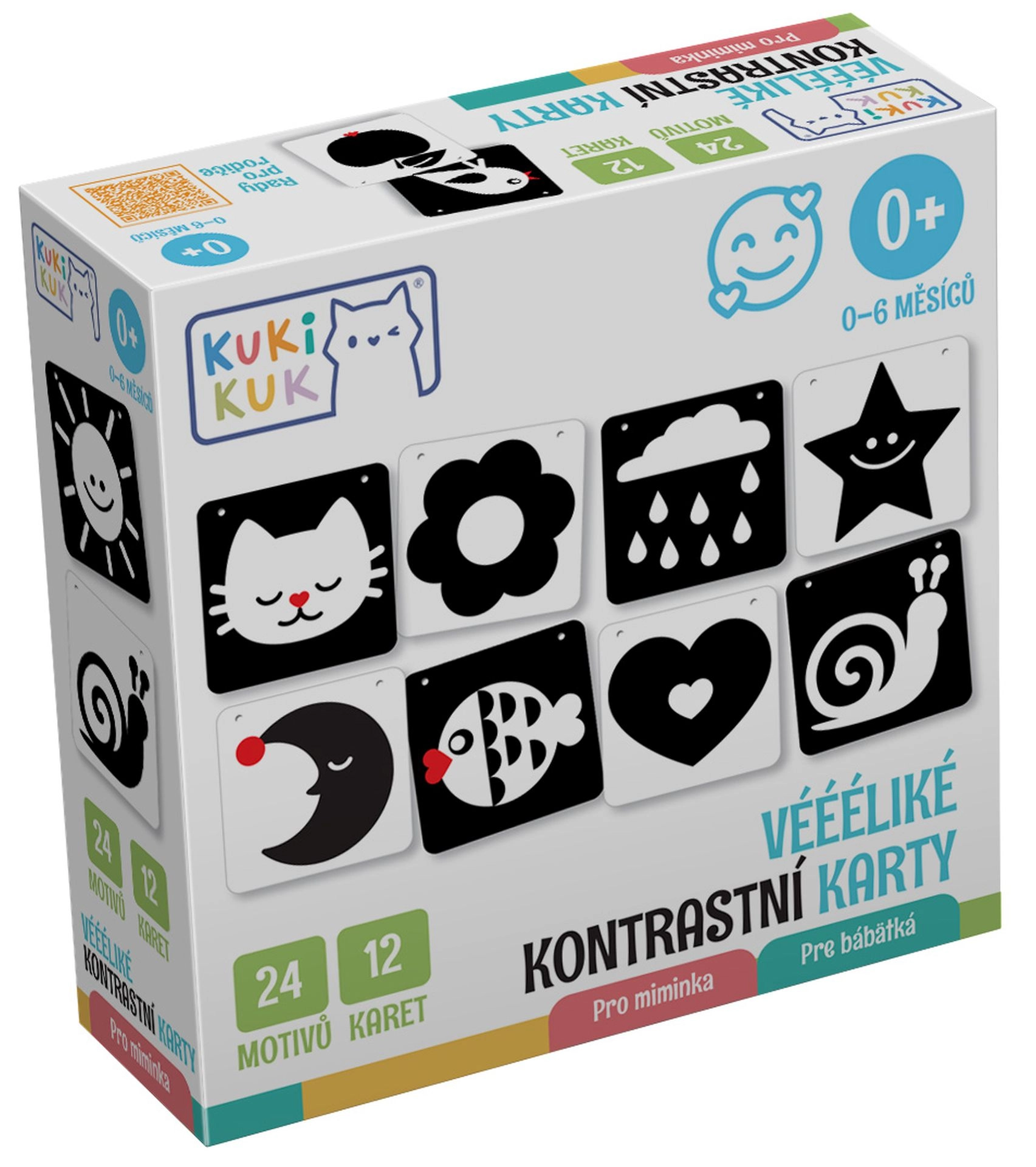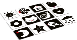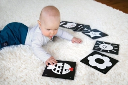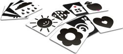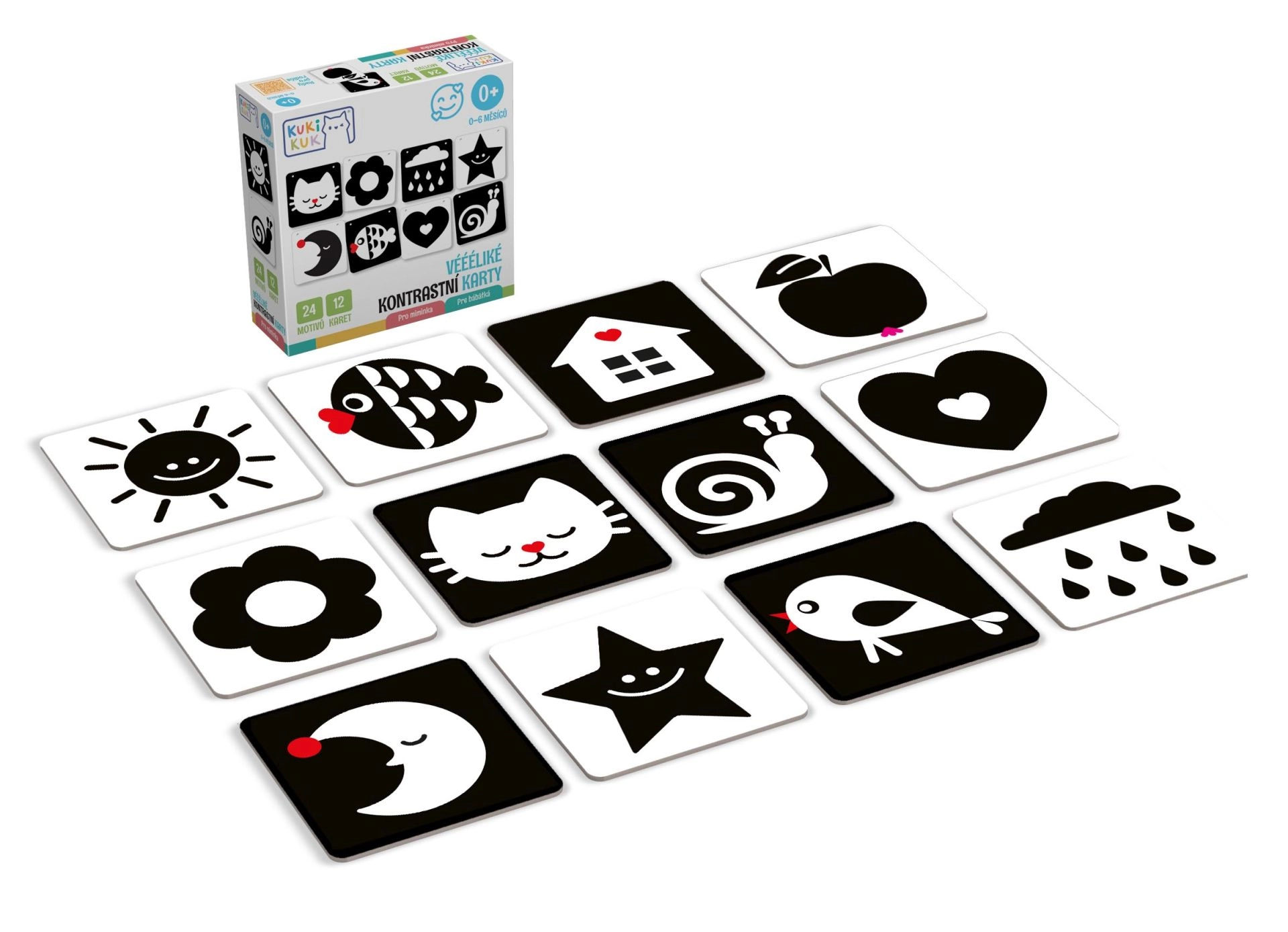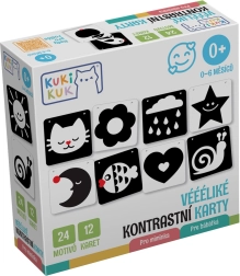 KukiKuk kontrastkaardid on ideaalne esimene “mänguasi”, millega saab alustada juba sünnist saati. Vastsündinud tajuvad eelkõige tugevaid kontraste – seetõttu mõjuvad mustvalged pildid neile tõhusalt, toetades nägemise, tähelepanu ja varajaste kognitiivsete oskuste arengut. Kaardid on piisavalt suured, vastupidavast materjalist ning kujundatud nii, et need köidaksid, kuid ei koormaks üle.