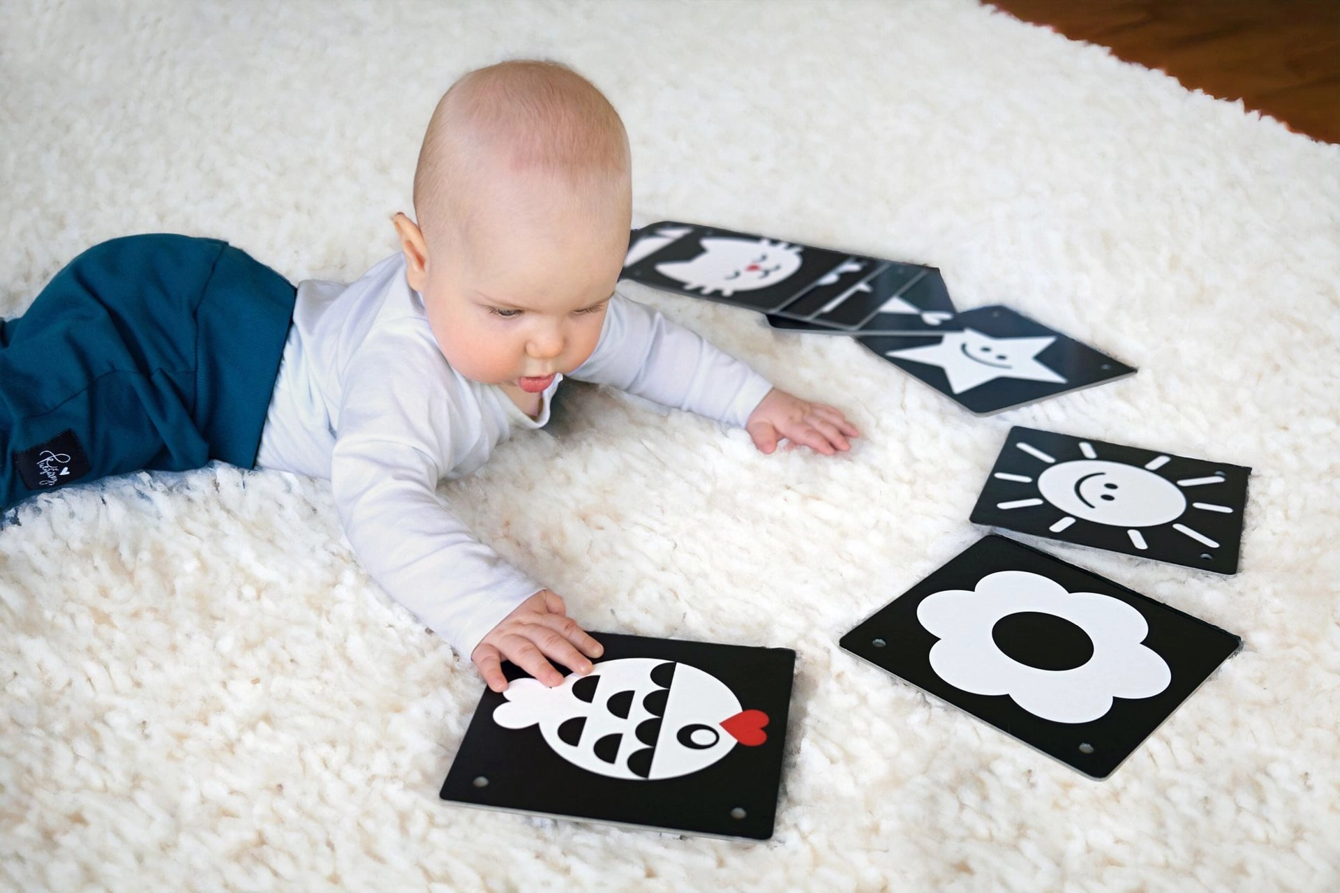 Lihtsad mustvalged illustratsioonid selgete vormidega arendavad detailsustaju ja köidavad loomulikult vastsündinute tähelepanu.
