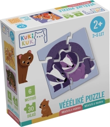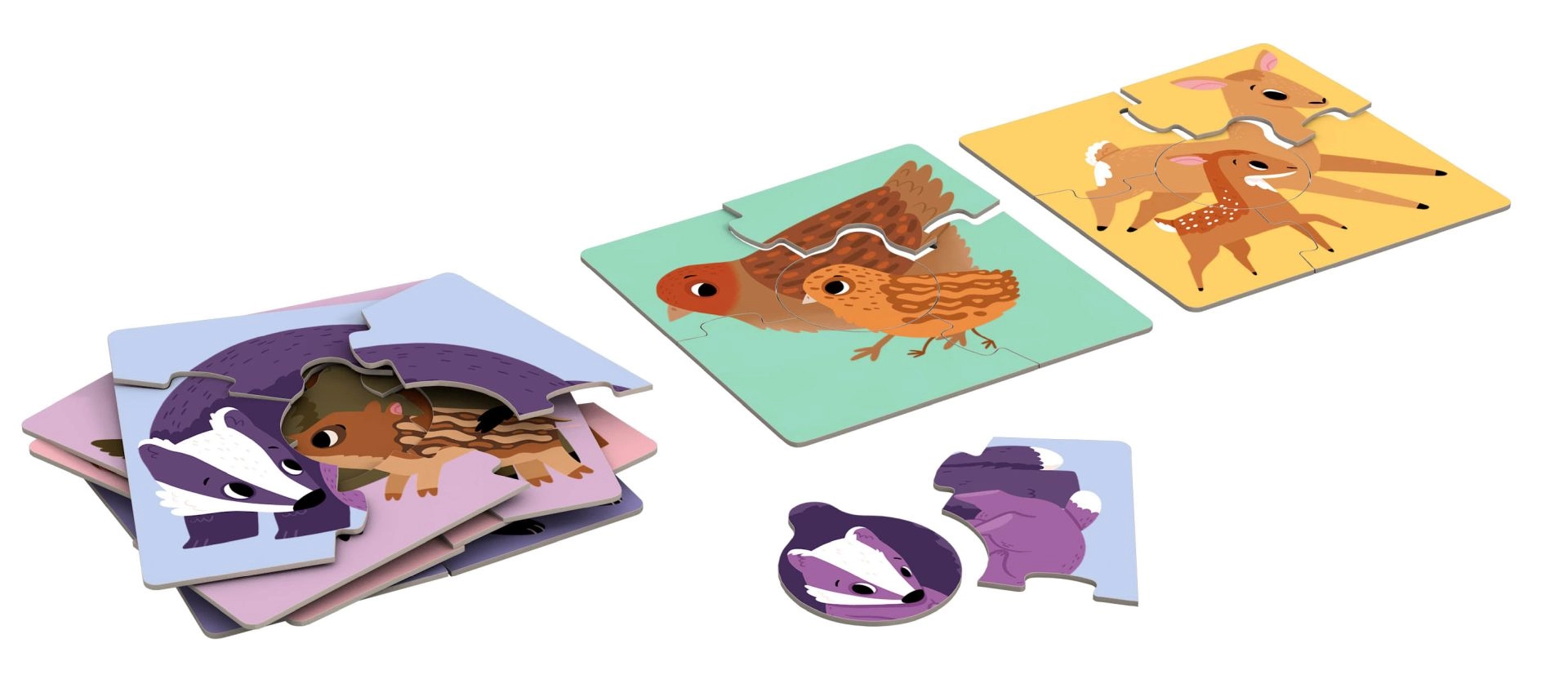 Komplekt sisaldab kuut ruudukujulist puslet loomaperede illustratsioonidega – karu, rebane, mäger, metssiga, kits ja lind. Iga motiiv koosneb neljast suurest tükist, valmiskuju on u 15,5 × 15,5 cm. Ühesugused ühenduslukkude kujundid suunavad lapsi süsteemselt proovima ja õigesti sobitama; kõikide motiivide poegade kesktükk on sama kujuga.