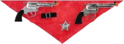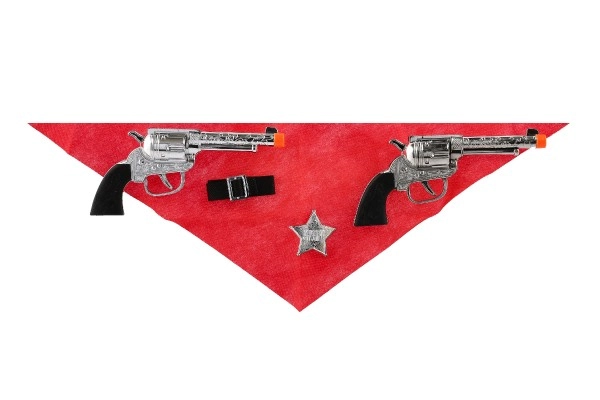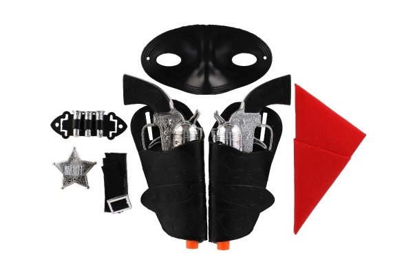 Kaks püstolit kabuuridega, šerifi rinnamärk, mask, punane rätt ja pannalvöö – kõik, mida on vaja täiusliku kovboikostüümi ja realistliku mängu jaoks.