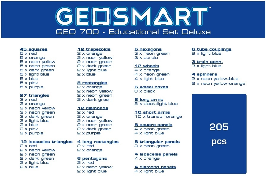 GeoSmarti hariduslik ehituskomplekt on ideaalne laste loovuse ja õppimise toetamiseks. Komplekt sisaldab: