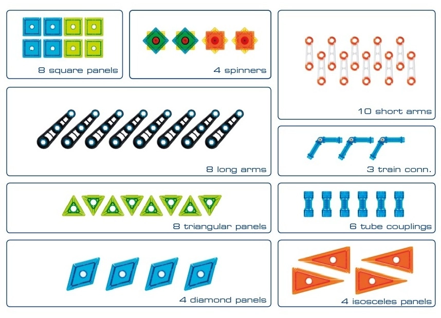 - 73 loomingulist komponenti, nagu rattad, spinerid ja ühendustükid