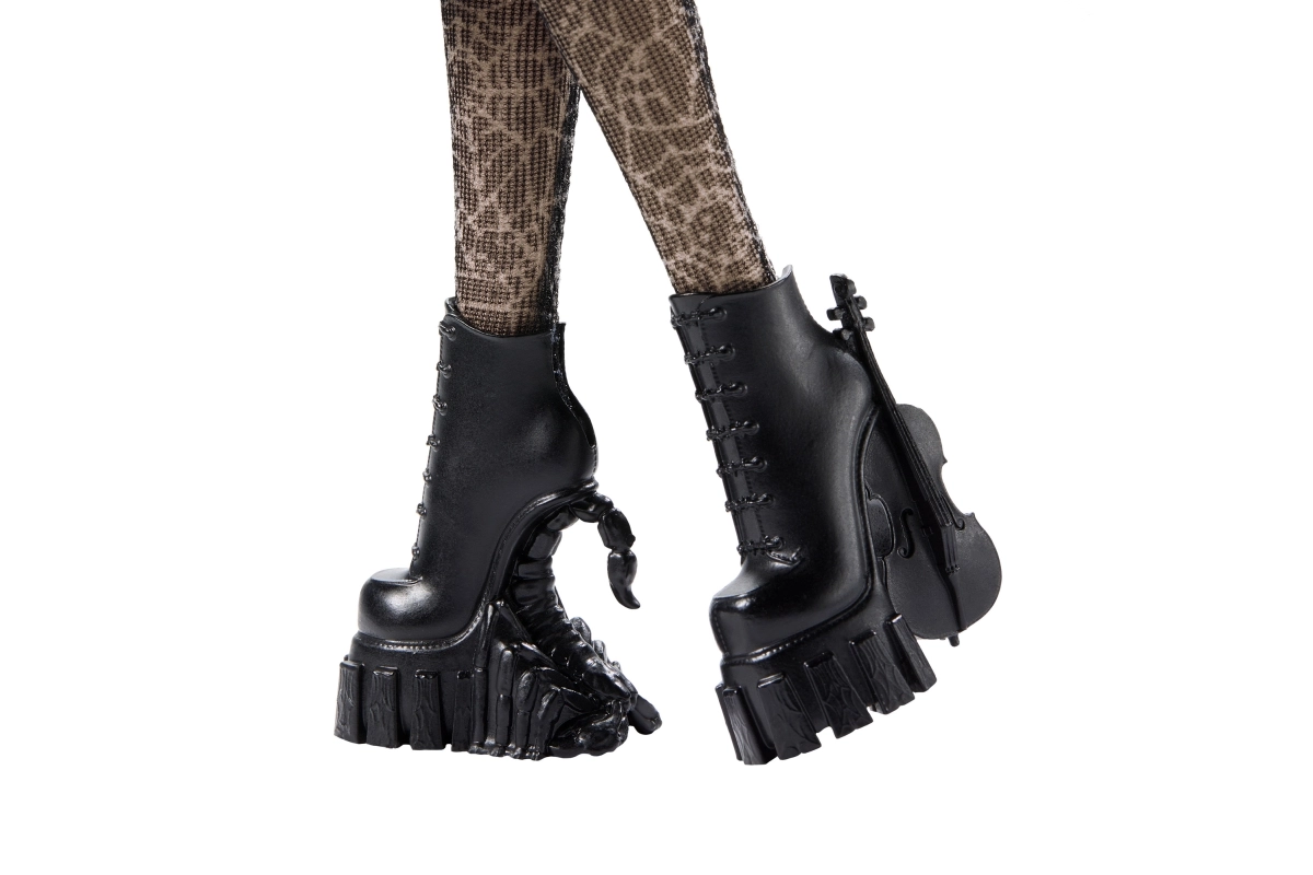 Viimistletud mustad kingad reljeefsete elementide ja tekstuursete paeltega annavad nukule silmapaistva, kogujaid köitva ilme.