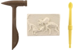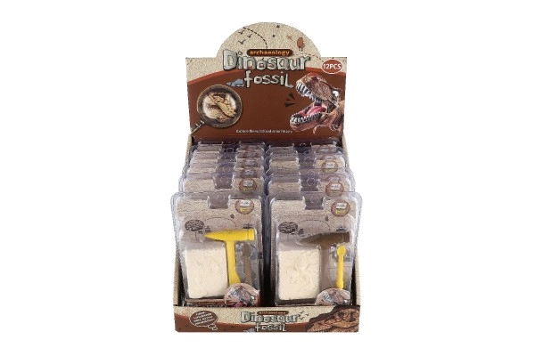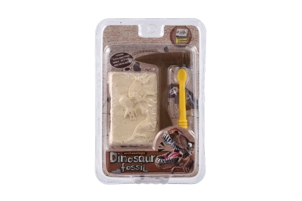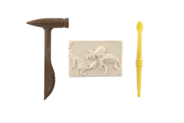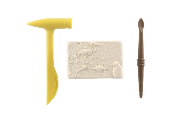 Komplektist leiate ploki dinosauruse luustiku jäljendiga ning vajalikud väljakaevamistööriistad – plasthaameri ja peitli.