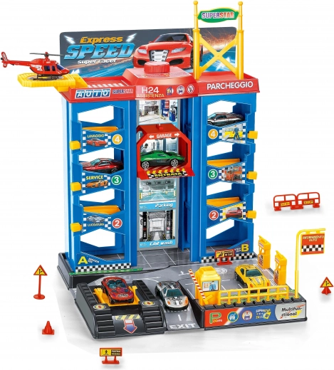 See detailselt viimistletud parkimisjaam pakub lastele realistlikku linnaliikluse mängu. Tänu vastupidavatele metallsõidukitele ja helikopterile jagub palju tegevust alates maandumisest heliporti kuni tankimiseni tanklas. Mehaaniline hoob parkimiskohtade juures võimaldab sujuvat autode väljasõitu garaažist.