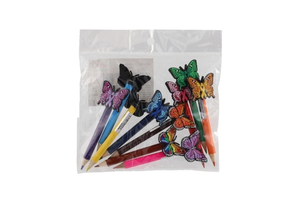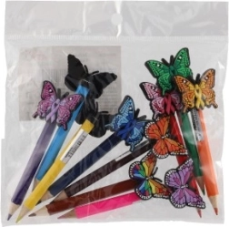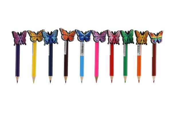 See komplekt sisaldab 10 eri värvi pliiatsit, millest igaühel on otsas liblikakujuline kaunistus. Kaunistused lisavad pliiatsitele mängulise ja dekoratiivse elemendi, mistõttu sobivad need suurepäraselt lastele või loovaks kirjutamiseks. Värvikirevad liblikad toovad sinu kirjutamisse ja joonistamisse veidi fantaasiat.