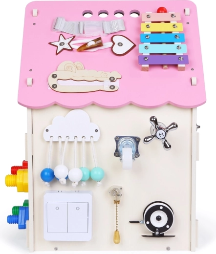 Interaktiivne puidust tegevusmaja arvukate elementidega sensoorseteks katsetusteks ja õppimiseks arendab peenmotoorikat, käe-silma koordinatsiooni ja iseseisvust. Lapsed harjutavad lõbusal viisil kinnitamist, sidumist, lülitamist, pööramist ja lukust avamist ning tutvuvad arvutelaua ja kellaga.