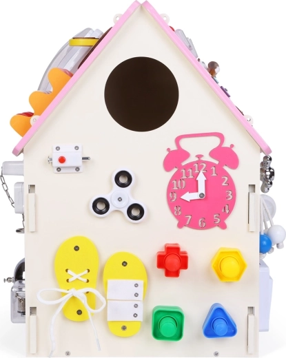 Avastage rikkalikult varustatud activity board tüüpi maja, mis ühendab mängu ja õppimise. Tänu mitmekülgsetele mehaanilistele elementidele – lukkudele, pannaldele, paeltele, ratastele ja lülititele – täiustavad lapsed peenmotoorikat ja loogilist mõtlemist ning arendavad loovust ja uudishimu.