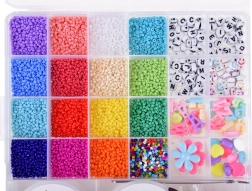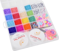 - Läbipaistev sektsioonidega organiseerija, 2× nöör, tähehelmed, täpipunktidega helmed, südame-, lille- ja lipsukujulised helmed, pisikesed helmed (16 värvi), pintsetid, käärid
