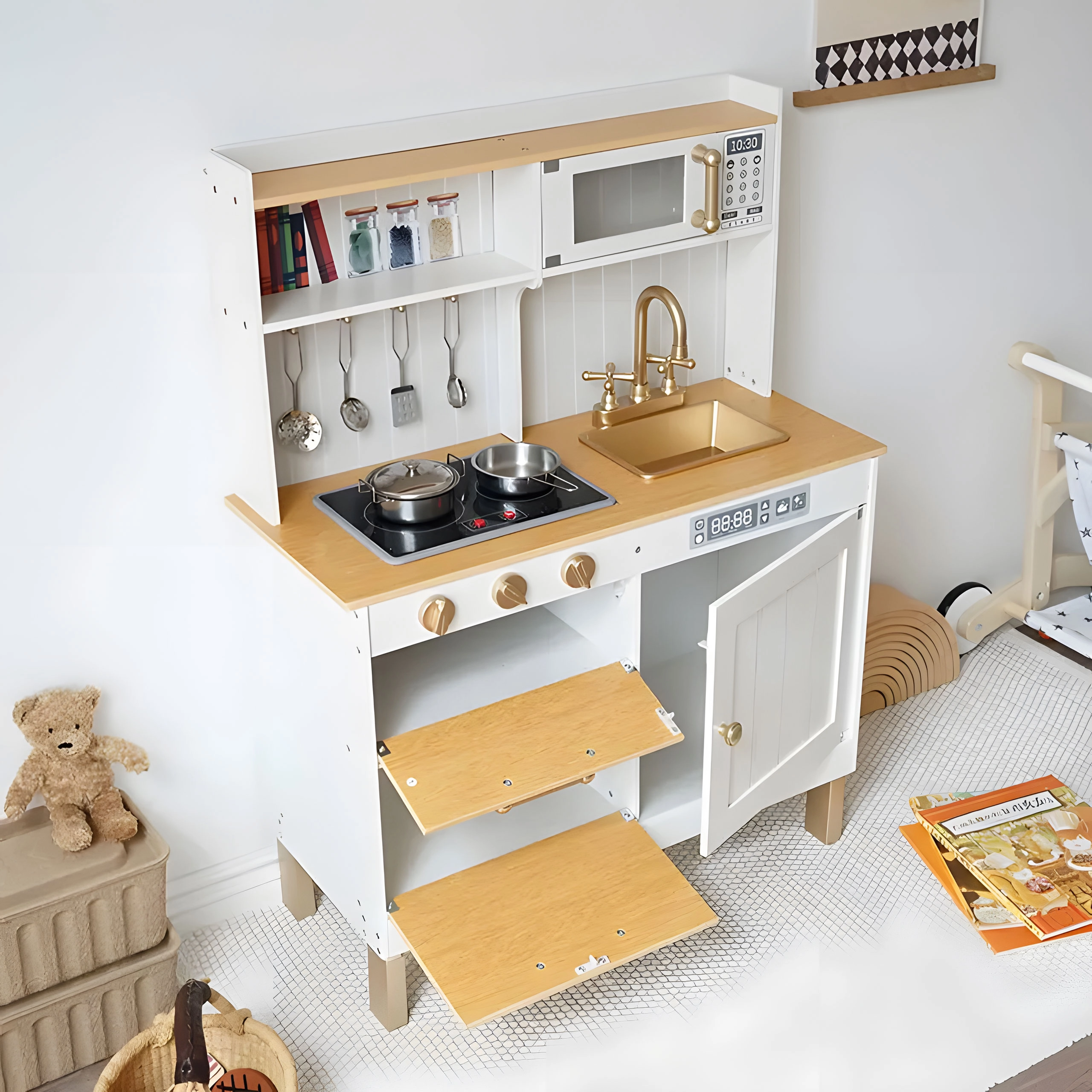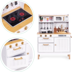 Köögil on LED-valgustusega põletid ja heliefektid, mis meenutavad tõetruult päris toiduvalmistamist. Mänguruumi laiendavad avatavad kapiluugid ja pööratavad nupud, mis tekitavad autentset