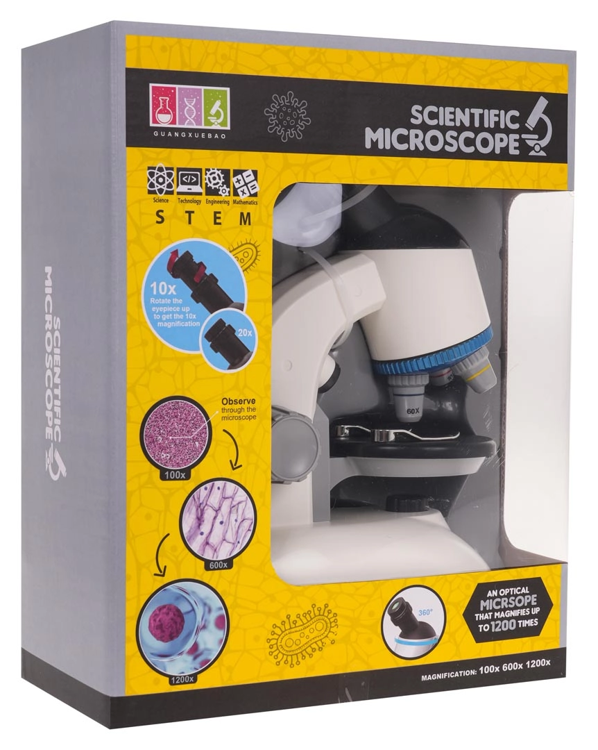 Noortele teadlastele mõeldud mikroskoop on valmistatud kõrgekvaliteedilistest materjalidest ning loodud inspireerima ja harima. See seade võimaldab vaatlemist erinevate suurendustega kuni 1200 korda, nii et iga noor avastaja saab uurida palja silmaga nähtamatuid detaile.