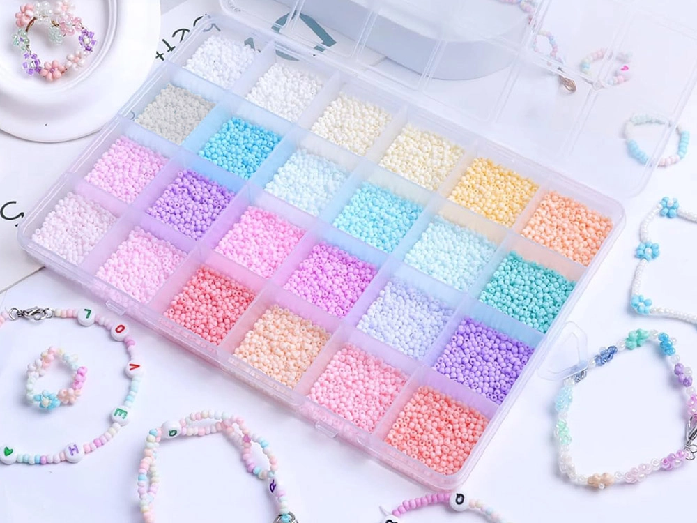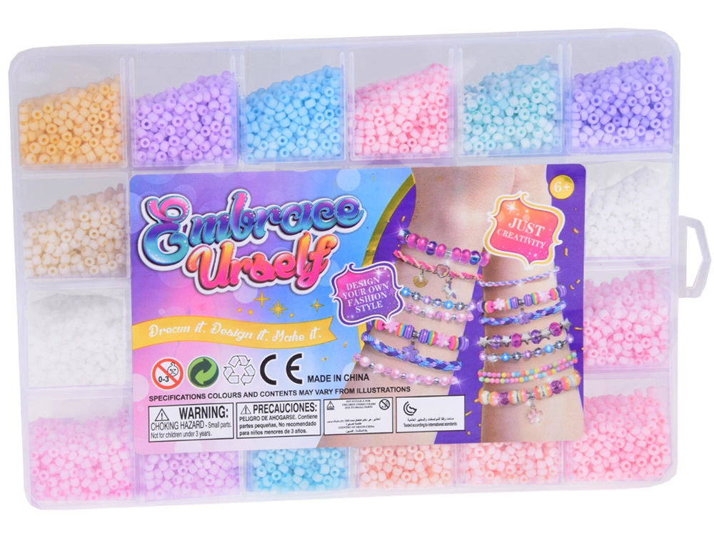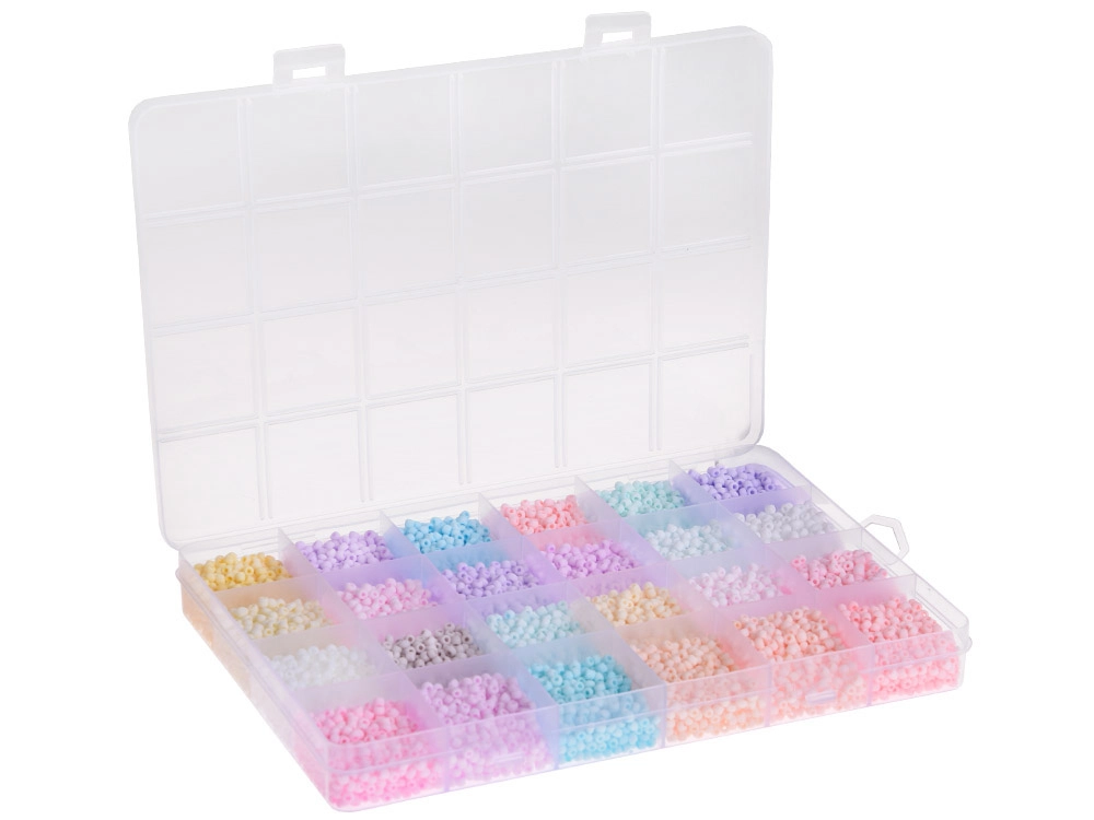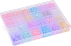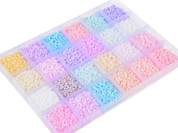 Komplektis on 24 erinevat pastellset helmeste värvi: roosad, lillad, sinised, beežid, rohelised, valged ja kollased. Need on paigutatud läbipaistvasse, piklikku karpi, mis on mugavalt lahtriteks jaotatud. Nii ei lähe helmed segamini ja nende korrastamine on lihtne.