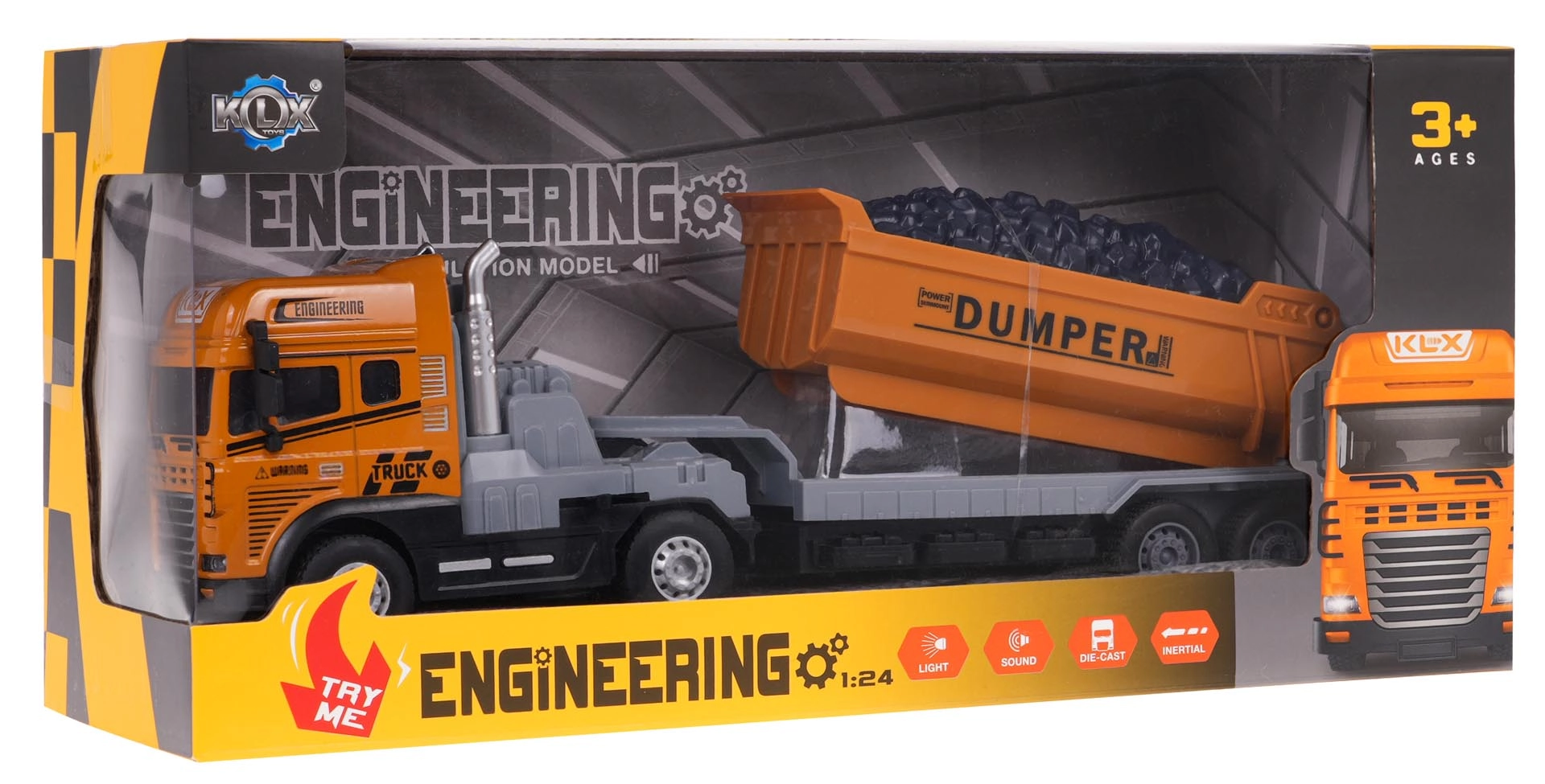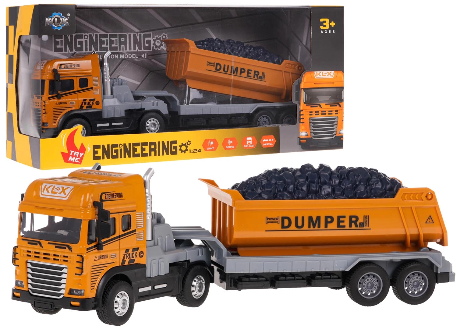 Avasta ehitusmängu lõbu selle realistliku 1:24 mõõtkavas kalluriga, mis sobib lastele alates 3. eluaastast. Sellel on valgusefektid, sõidu-, signaali- ja tagurdamishelid, eemaldatav ja kallutatav haagis ning kummirattad parema haarduvuse jaoks. Vastupidav metallkabiin ja kvaliteetne plast tagavad pika kasutusea ja turvalise mängu.