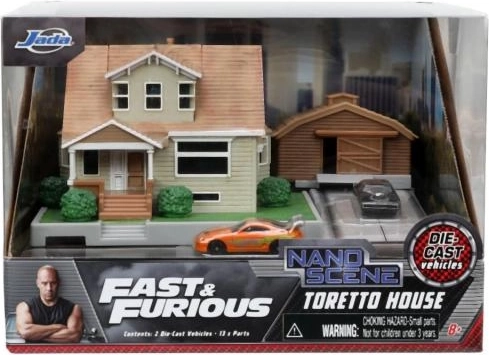 Komplektis on kaks legendaarset autot – Dodge Charger ja Toyota Supra – metallkorpusega, vabajooksuga, pöörlevate rataste ja kummirehvidega realistse välimuse saavutamiseks. Dioramat täiendavad aiagrill ja mööbel, mis loovad stseeni, mis on tuttav filmidest.