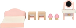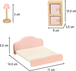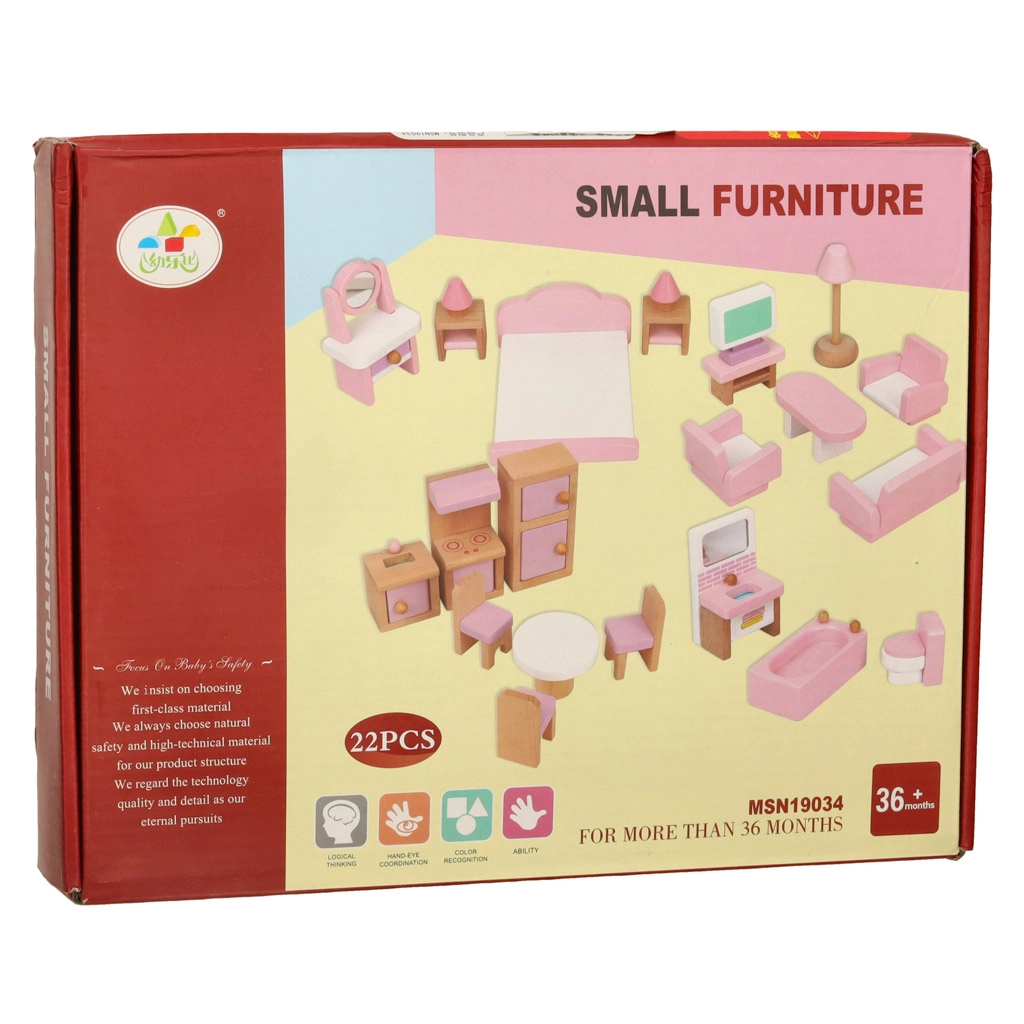 Stiilne puidust nukkudemaja mööblikomplekt sisustab elutoa, magamistoa, vannitoa ja köögi. Kvaliteetne naturaalne puit, ohutud värvid roosas ja valges, kokku 22 osa. Arendab loovust, ruumilist mõtlemist ja õppimist läbi mängu alates 3. eluaastast.