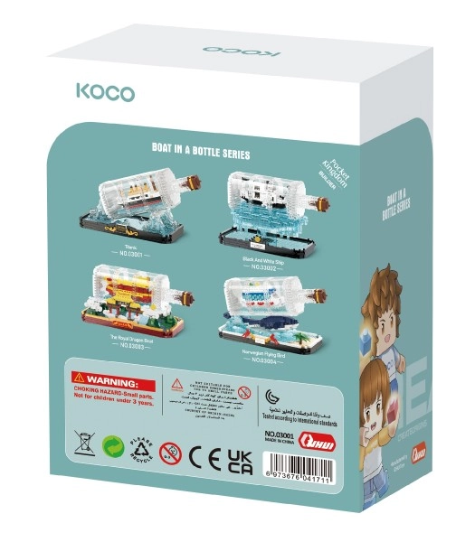 KOCO ehituskomplekt toob teie elutuppa Titanicu kaasahaarava loo. Selle laeva ehitamine pudelisse ei aita üksnes treenida osavust, vaid ka sukelduda ajaloolisse maailma. Iga mudeli detail, millel on kokku 918 tükki, pakub ainulaadset kogemust: