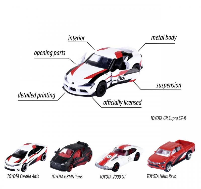 - 5 tk pisiautosid (TOYOTA GR Supra, TOYOTA GRMN Yaris, TOYOTA Hilux Revo, TOYOTA Corolla Altis, TOYOTA 2000 GT)