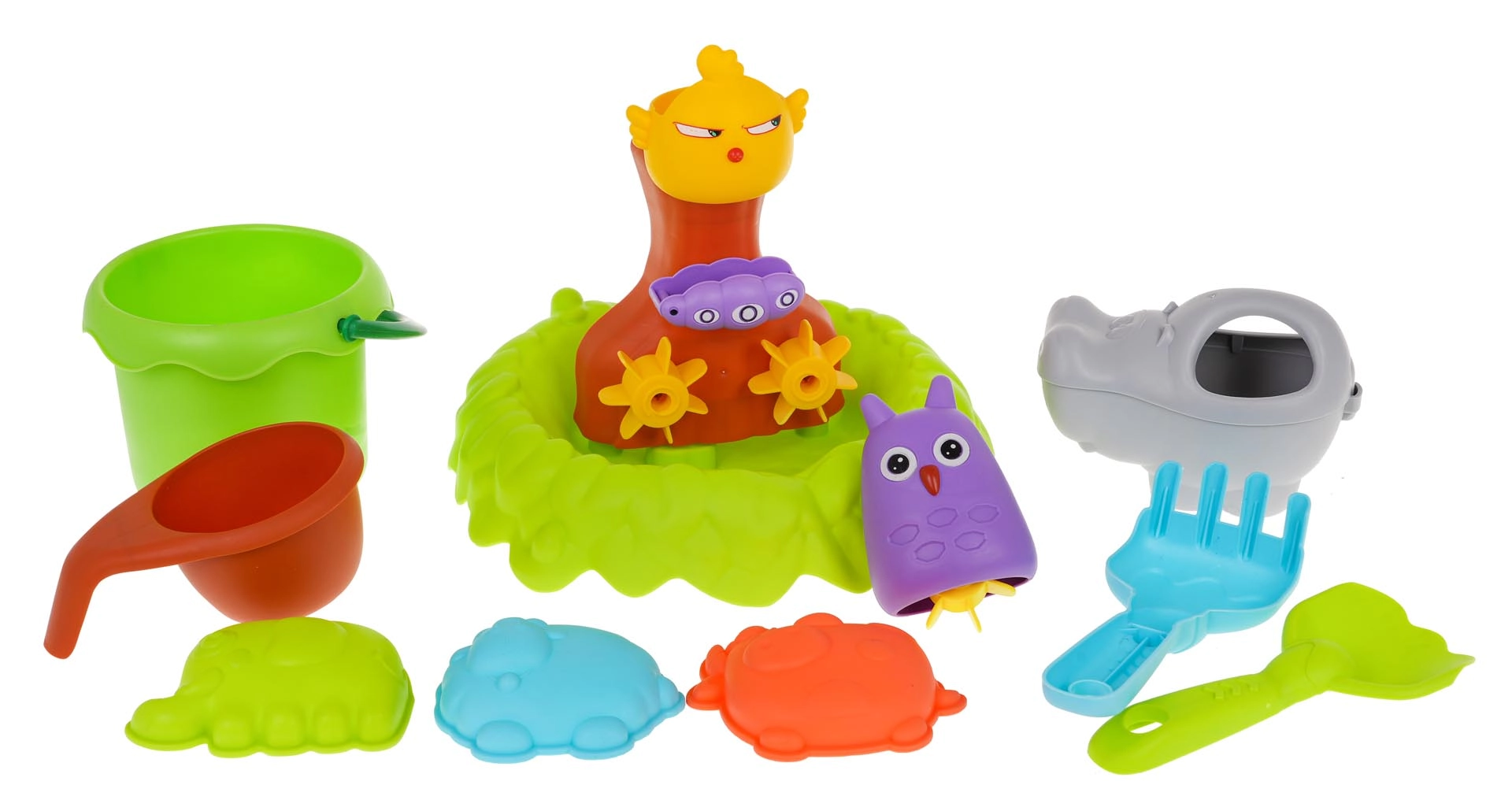 Ämber, kastekann, lehter, kühvel, reha ja 3 vormi laiendavad mänguvõimalusi nii liivas kui vees.