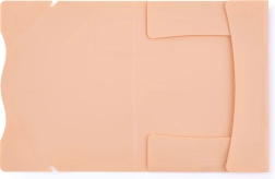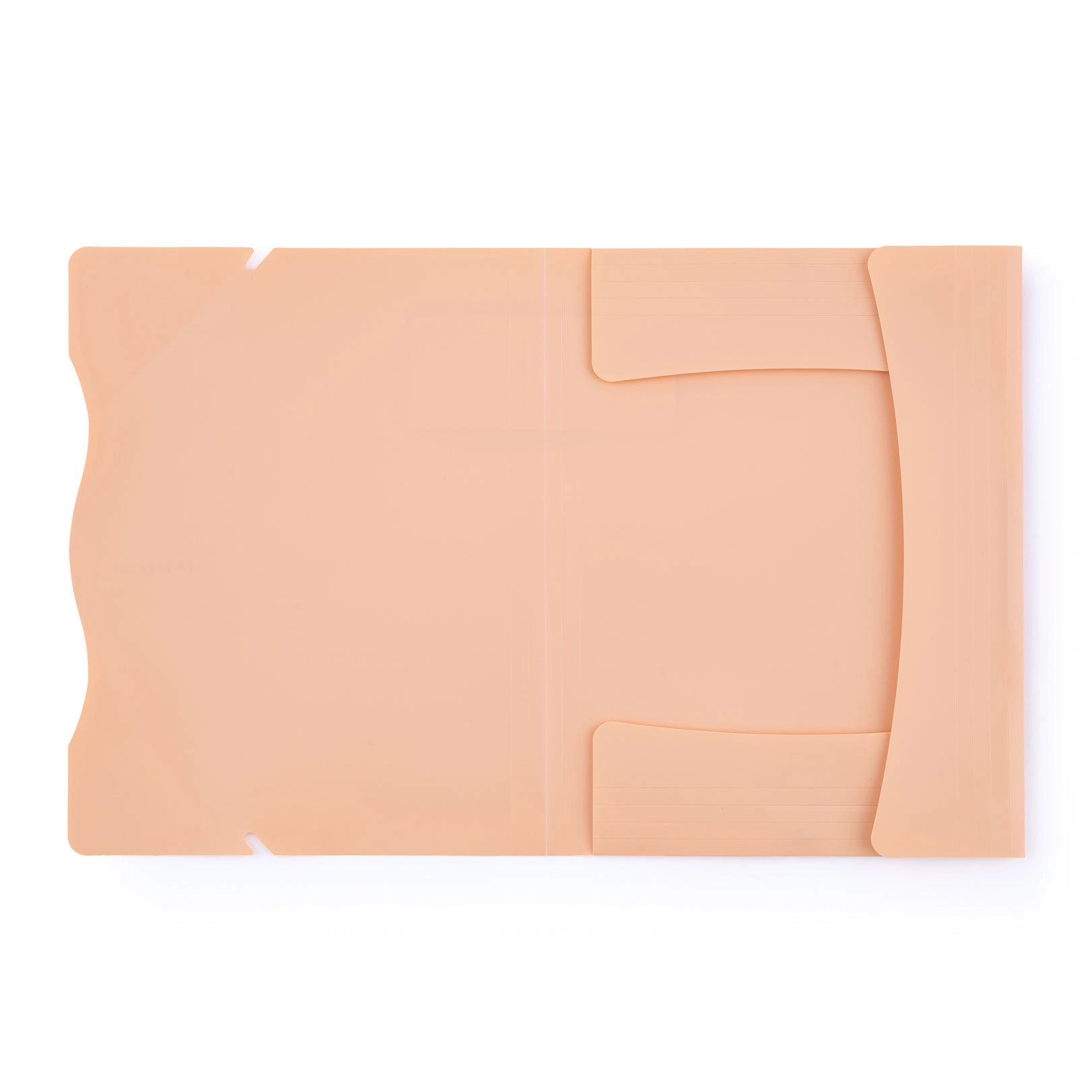 Kolme klapiga kaust polüpropüleenist pastelse aprikoositooniga, kummipaelaga kinnituse ja laieneva seljaga kuni 250 A4-lehe mahutamiseks.