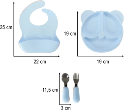 Praktiline 4-osaline silikoonist laste söögikomplekt sinises toonis armsa karumotiiviga tagab mugava ja ohutu einestamise. Sisaldab jaotustega taldrikut, taskuga põlle ja ergonoomilisi söögiriistu libisemisvastase viimistlusega. Valmistatud toidukvaliteediga silikoonist, kahjulike aineteta, lihtne puhastada ja soodustab iseseisvat söömist.