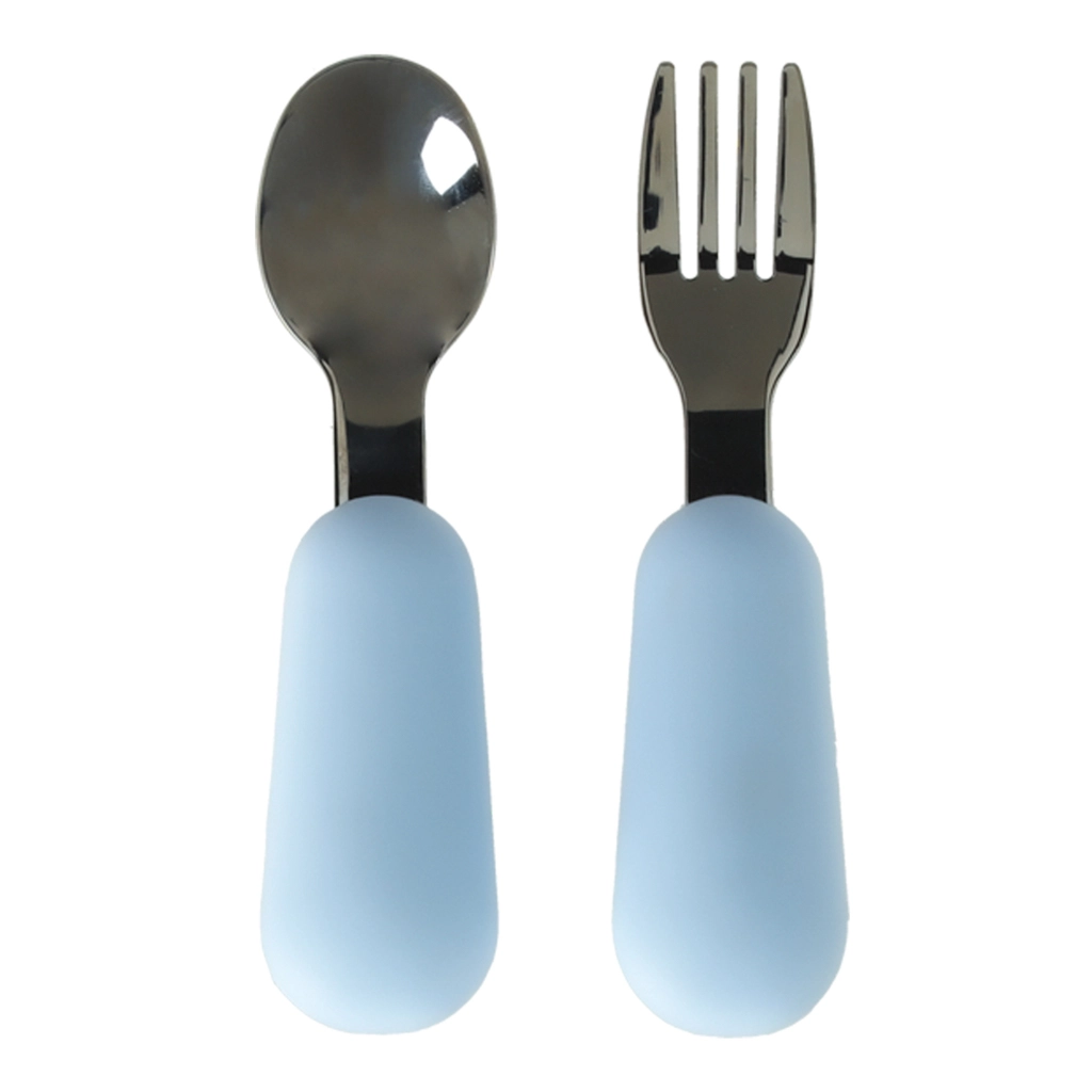 Teelusikas ja kahvel on roostevabast terasest otstega ning pehmete, libisemisvastaste silikoonist käepidemetega, mis teevad hoidmise kindlamaks ja kasutamise lihtsamaks.