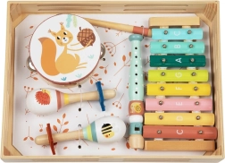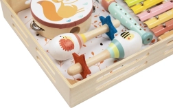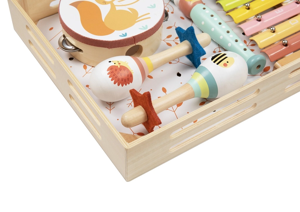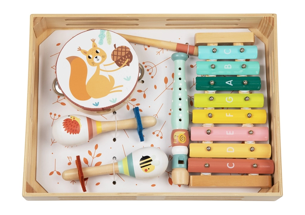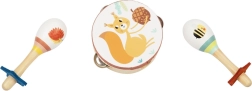 Komplektis on sellised instrumendid nagu tamburiin, marakas ja kellamäng, mis köidavad lapsi ja julgustavad eneseväljendust. Lõbus metsloomade disain tõmbab laste tähelepanu ja aitab neil paremini muusikast aru saada.