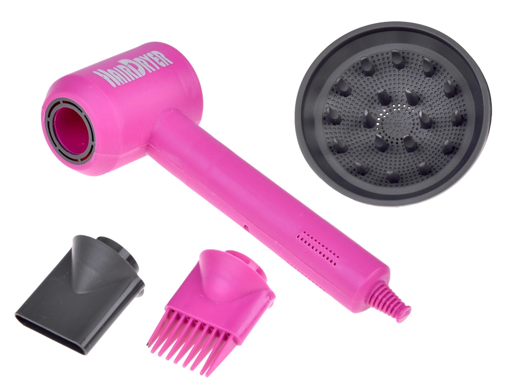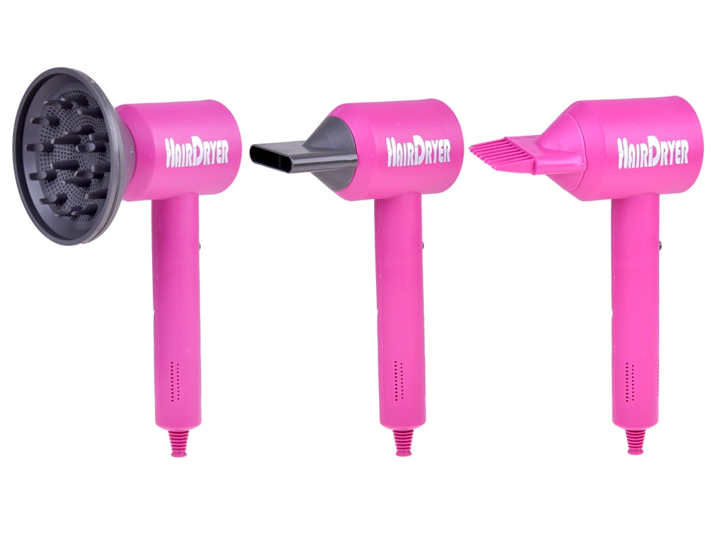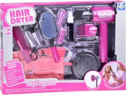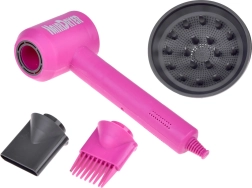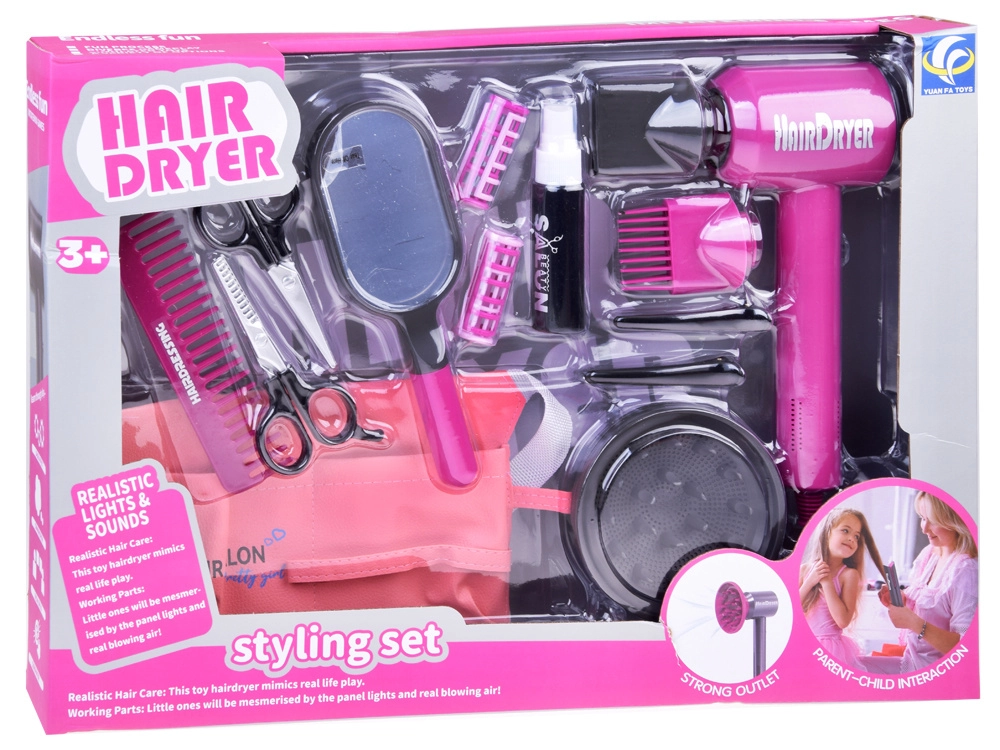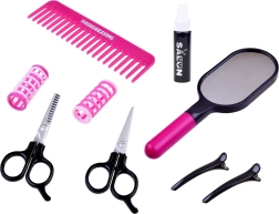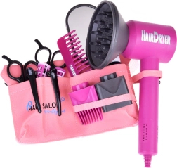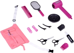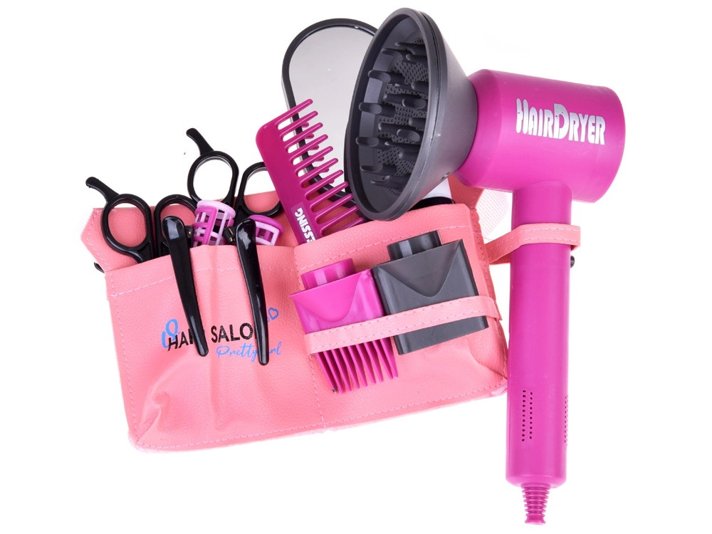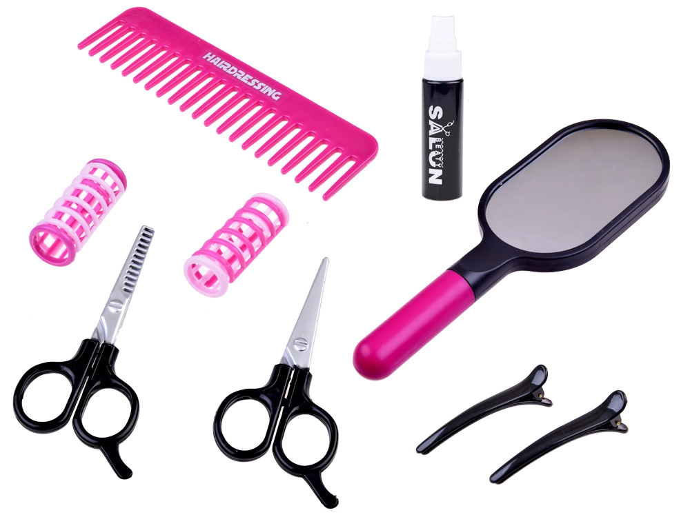 Komplektis on patareitoitel laste föön vahetatavate otsikutega erinevate stiilide loomiseks, käärid, kamm, peegel, klambrid, rullid ja pihustuspudel – kõik õrnas roosas disainis maksimaalse mängurõõmu jaoks. Suurepärane kingiidee igale väikesele juuksurile.