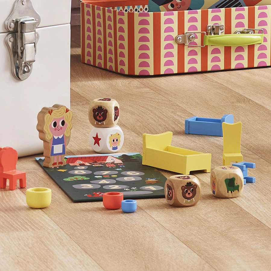 Mäng on soovitatav alates 3. eluaastast ning sisaldab mitmesuguseid mänguelemente, mis pakuvad lõbu nii väikestele kui suurtele. Komplektis on: 1 papist mängulaud, 1 puidust Kuldjuuks, 2 puidust täringut, 3 puidust voodit, 3 tooli, 3 kaussi ja 1 puuvillane kott.