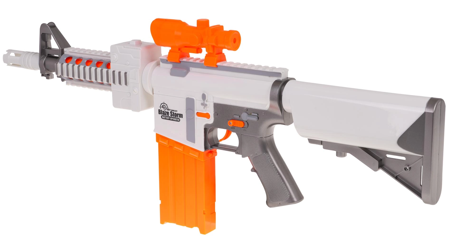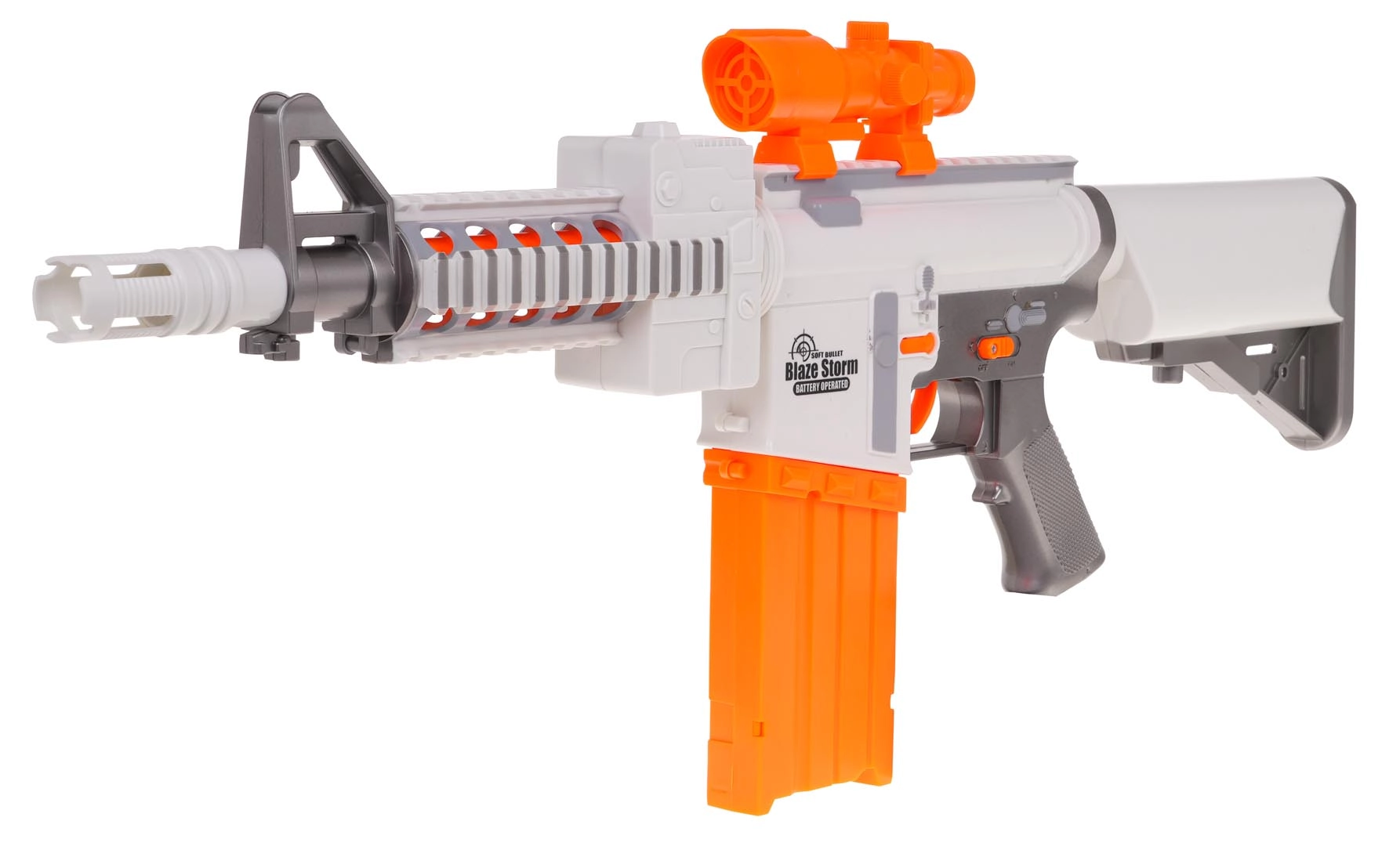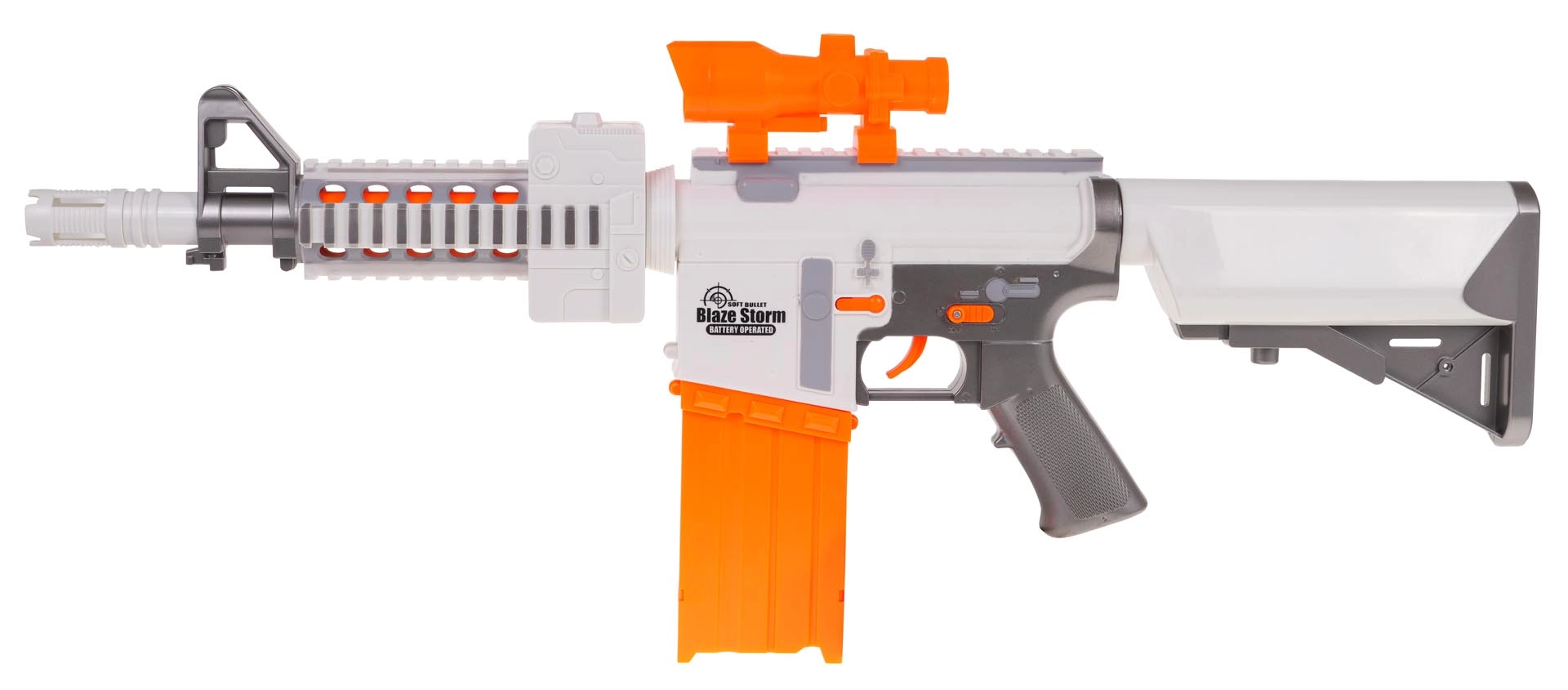 Nauti põnevat action-meelelahutust BLAZE STORM blasteriga atraktiivses valge–oranži värvikombinatsioonis. Tänu poolautomaatsele režiimile tulistad kergesti noolt noole järel ning suur alt sisestatava mehhanismiga 10-nooleline salv hoiab tempo üleval. Reguleeritav sihik aitab täpsemalt sihtida ja vahtnooled pehme kummist otsikuga on mängus ohutumad.