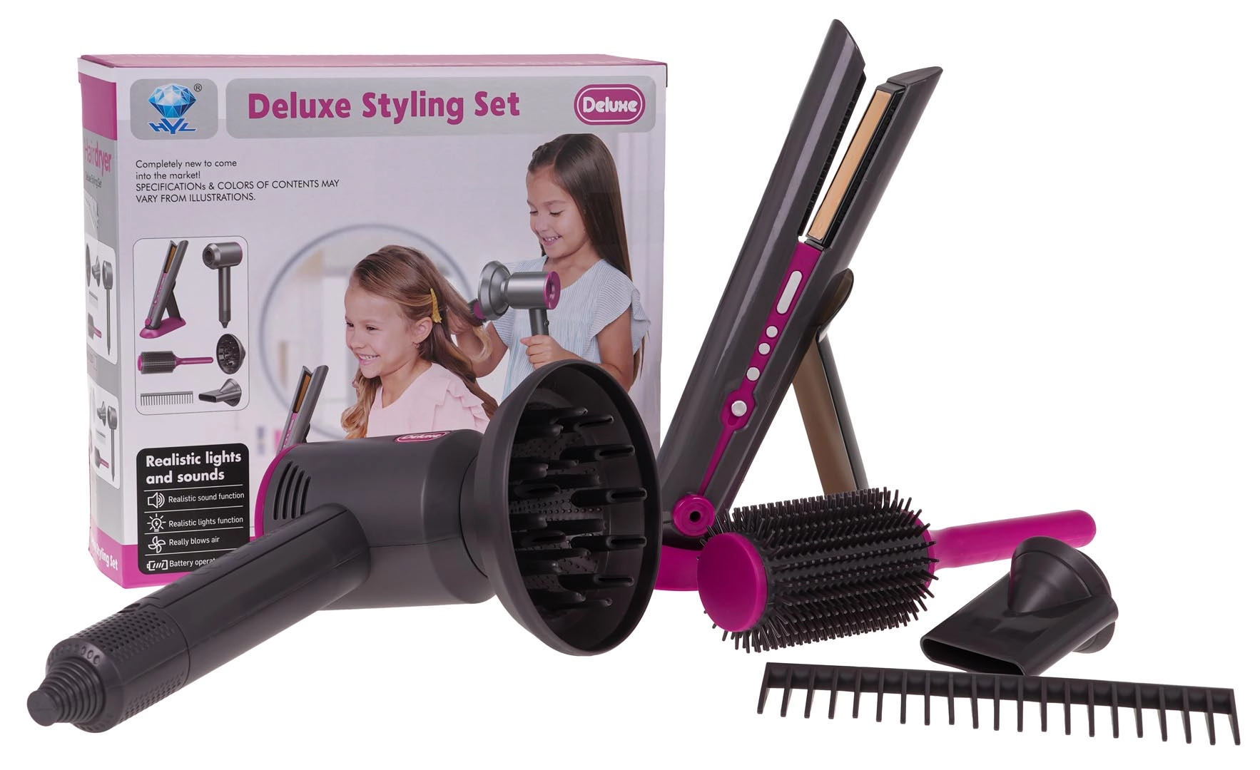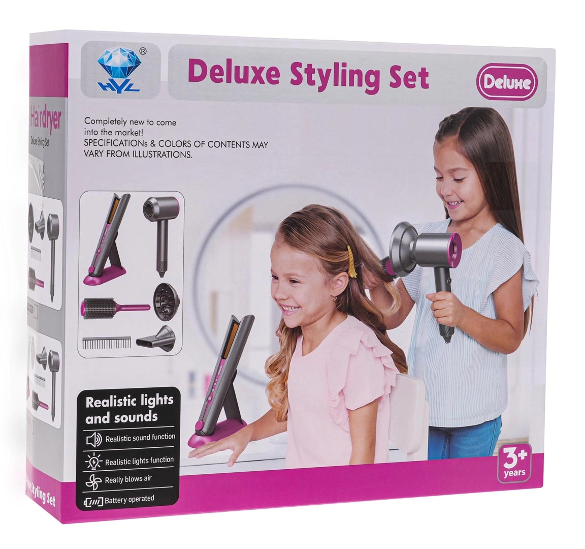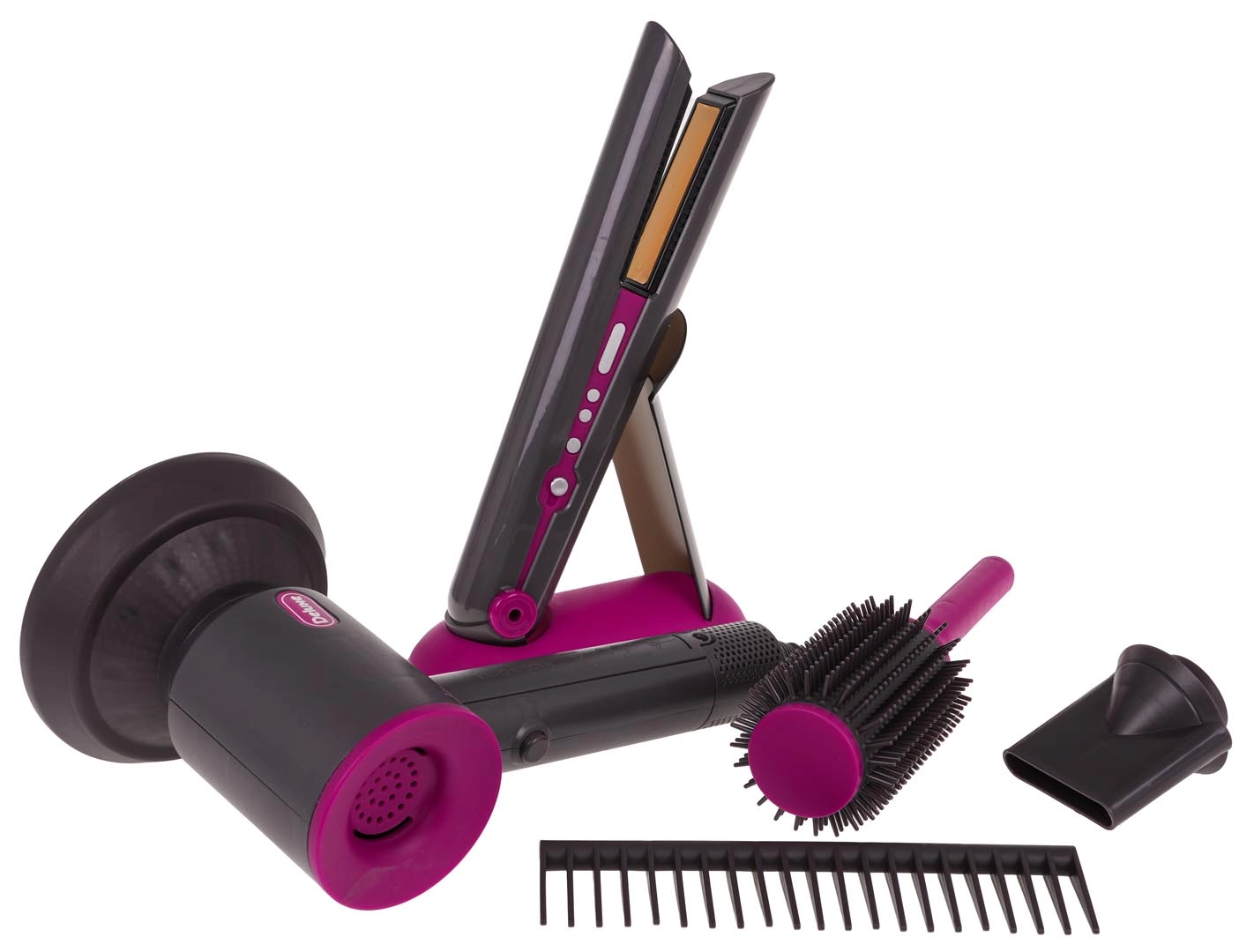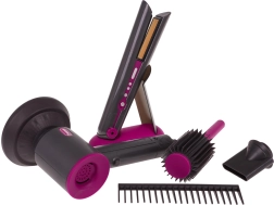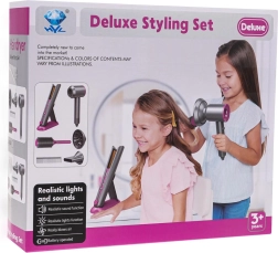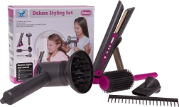 Ideaalne juuksurikomplekt lastele, kes soovivad saada väikesteks juuksuriteks. Rikkalikult varustatud komplekt sisaldab vahetatavate otsikutega fööni, juuksesirgendajat, kammi ja harja. Föön töötab kahe AA-patareiga (ei kuulu komplekti) ja teeb föönitamisele omaseid helisid. Sirgendaja süttib sisselülitamisel ja teeb tüüpilisi helisid.